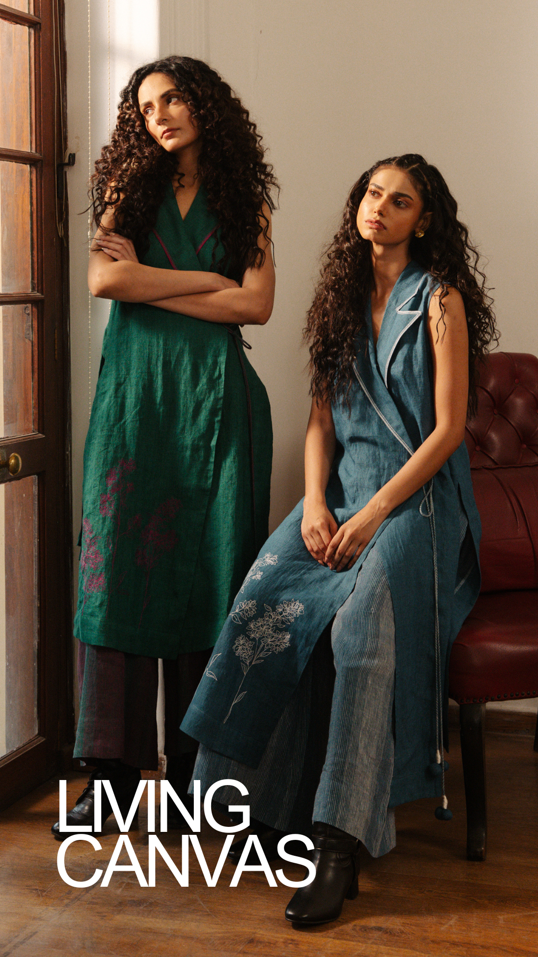 Where serenity meets defiance — French blue linen holds the same whisper of bougainvillea and Kahlo’s unflinching voice. The kurta blooms in forest green linen, the lapel highlighted with white selvedge. This is a set for women who move with grace and a touch of rebellion.