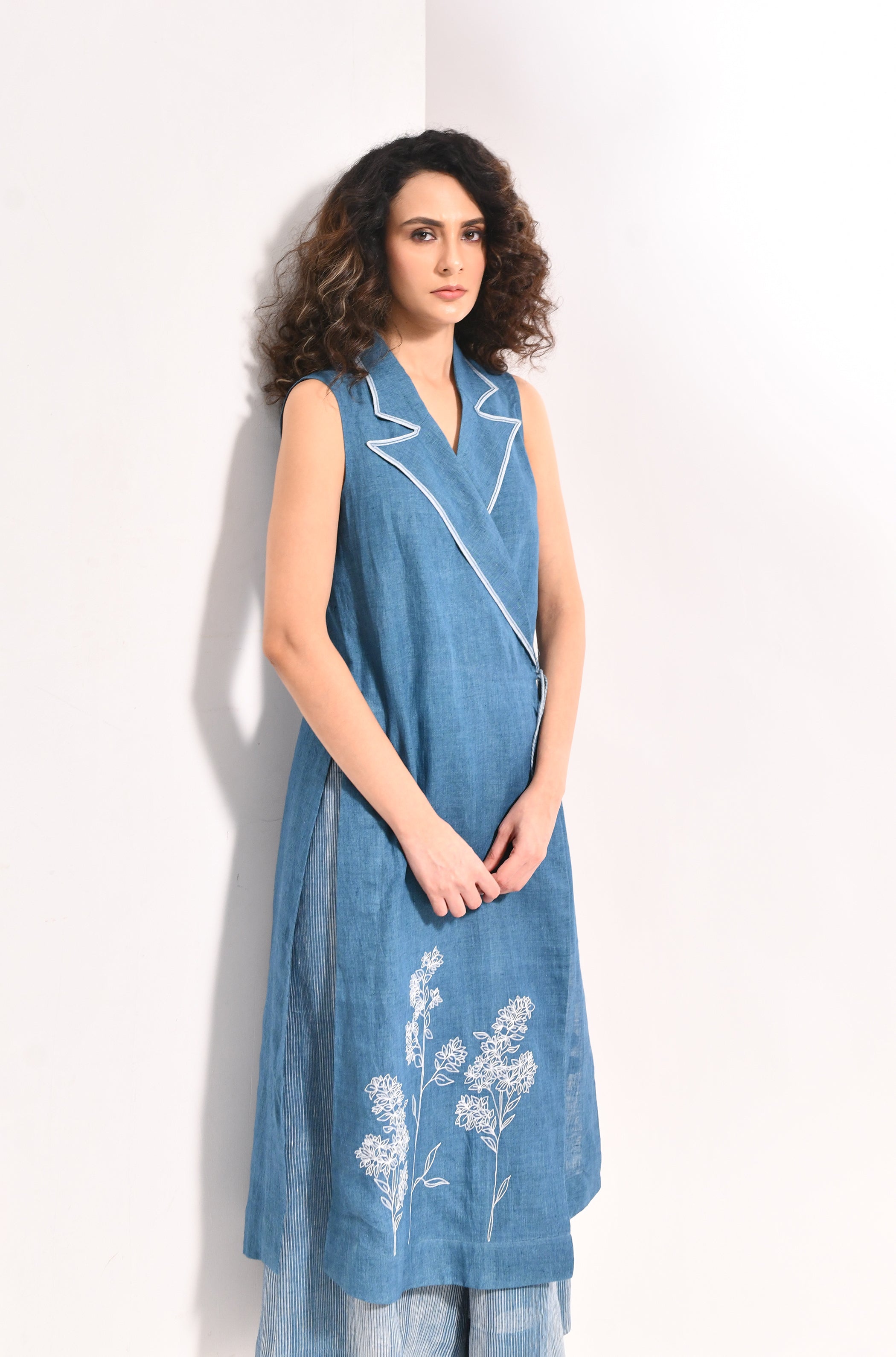 Where serenity meets defiance — French blue linen holds the same whisper of bougainvillea and Kahlo’s unflinching voice. The kurta blooms in forest green linen, the lapel highlighted with white selvedge. This is a set for women who move with grace and a touch of rebellion.