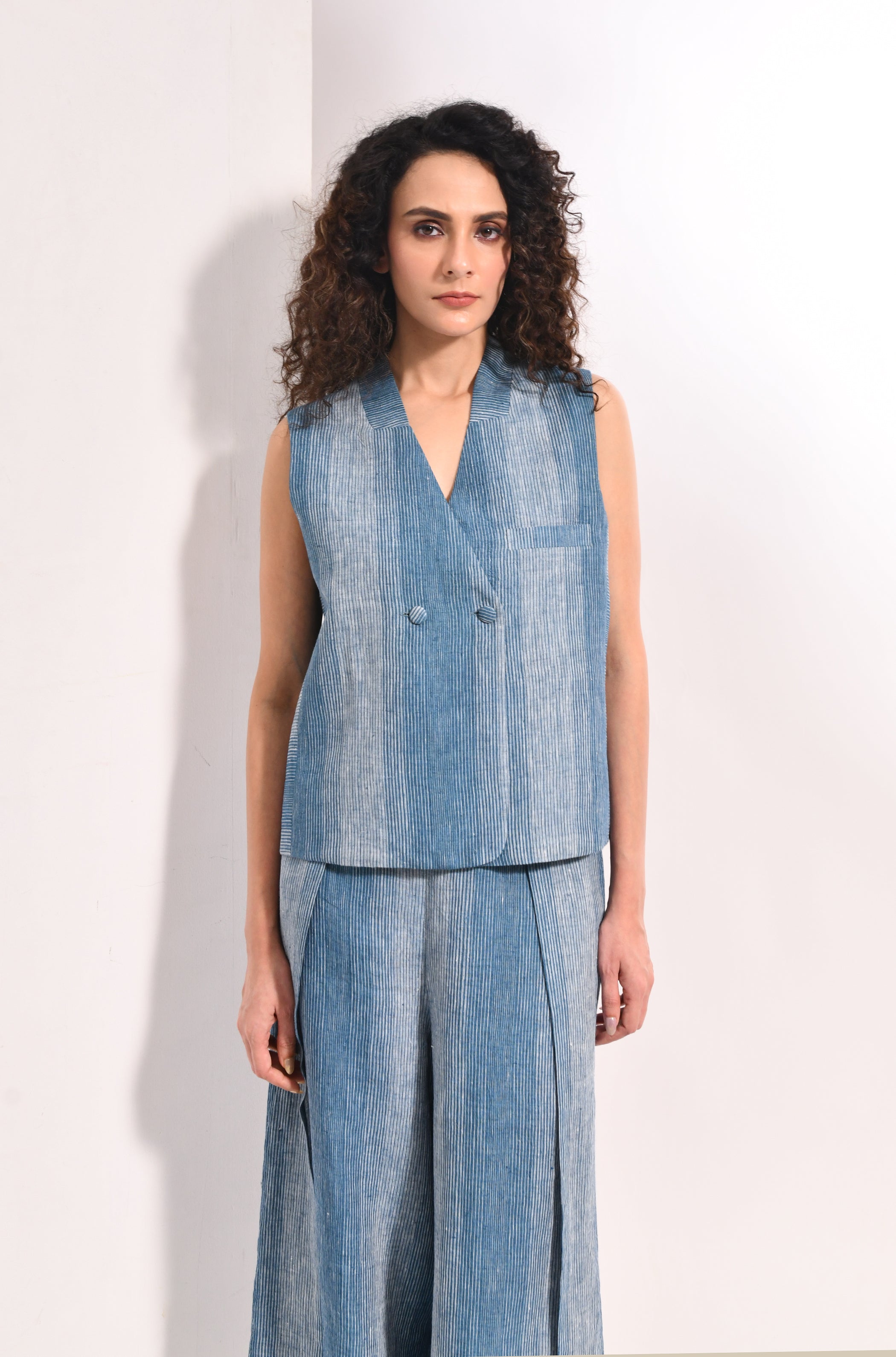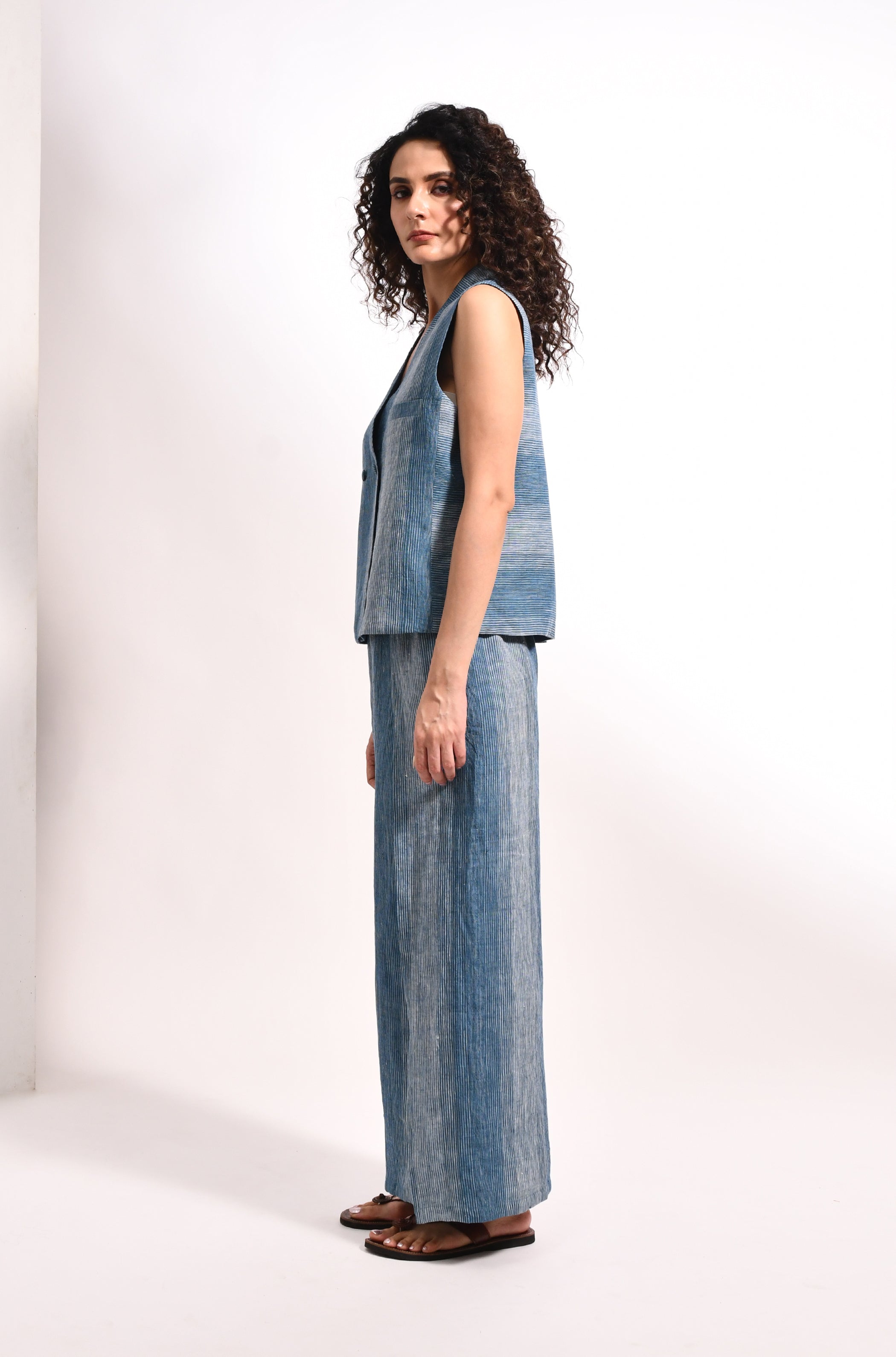 Geometry softened — striped waistcoat panels shifting between vertical and horizontal, grounded by fluid trousers that overlap without seams.