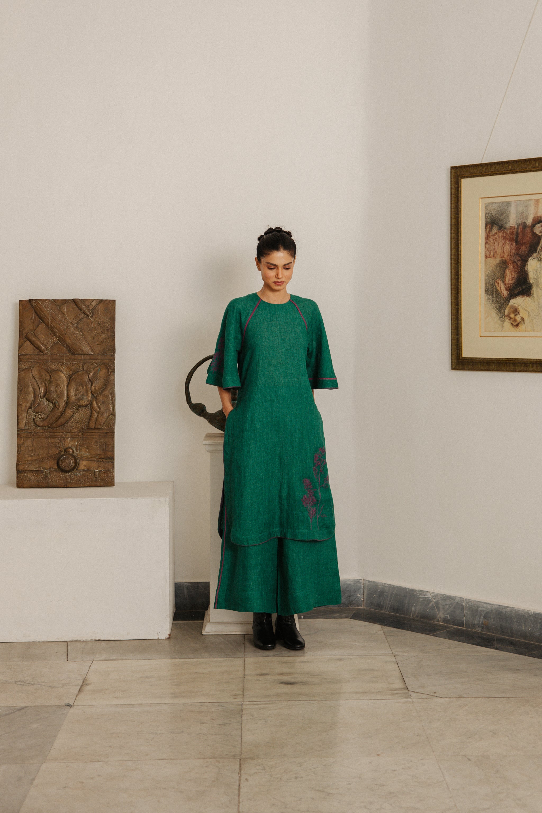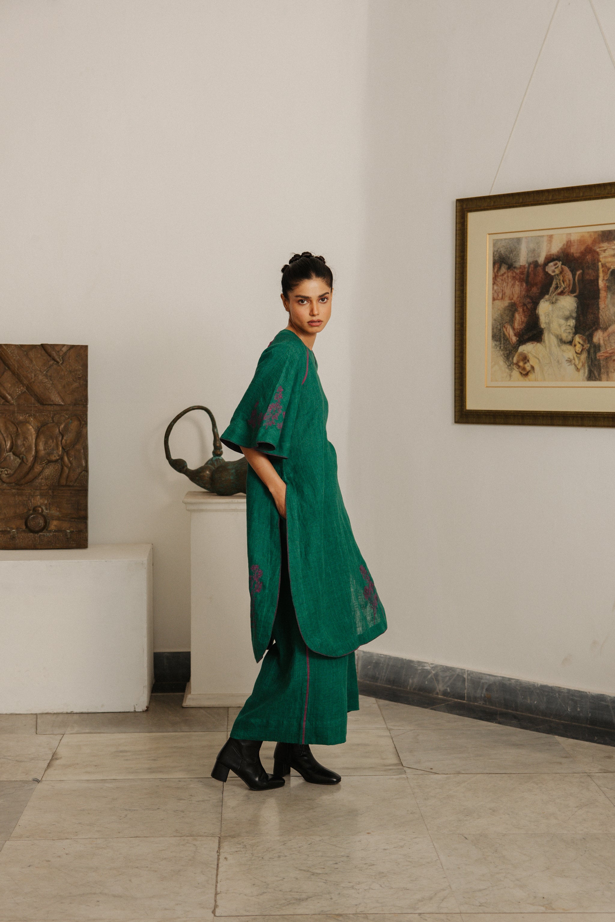 With sweeping raglan sleeves, this ensemble becomes a canvas for Simone de Beauvoir’s timeless words — “One is not born, but rather becomes, a woman.”