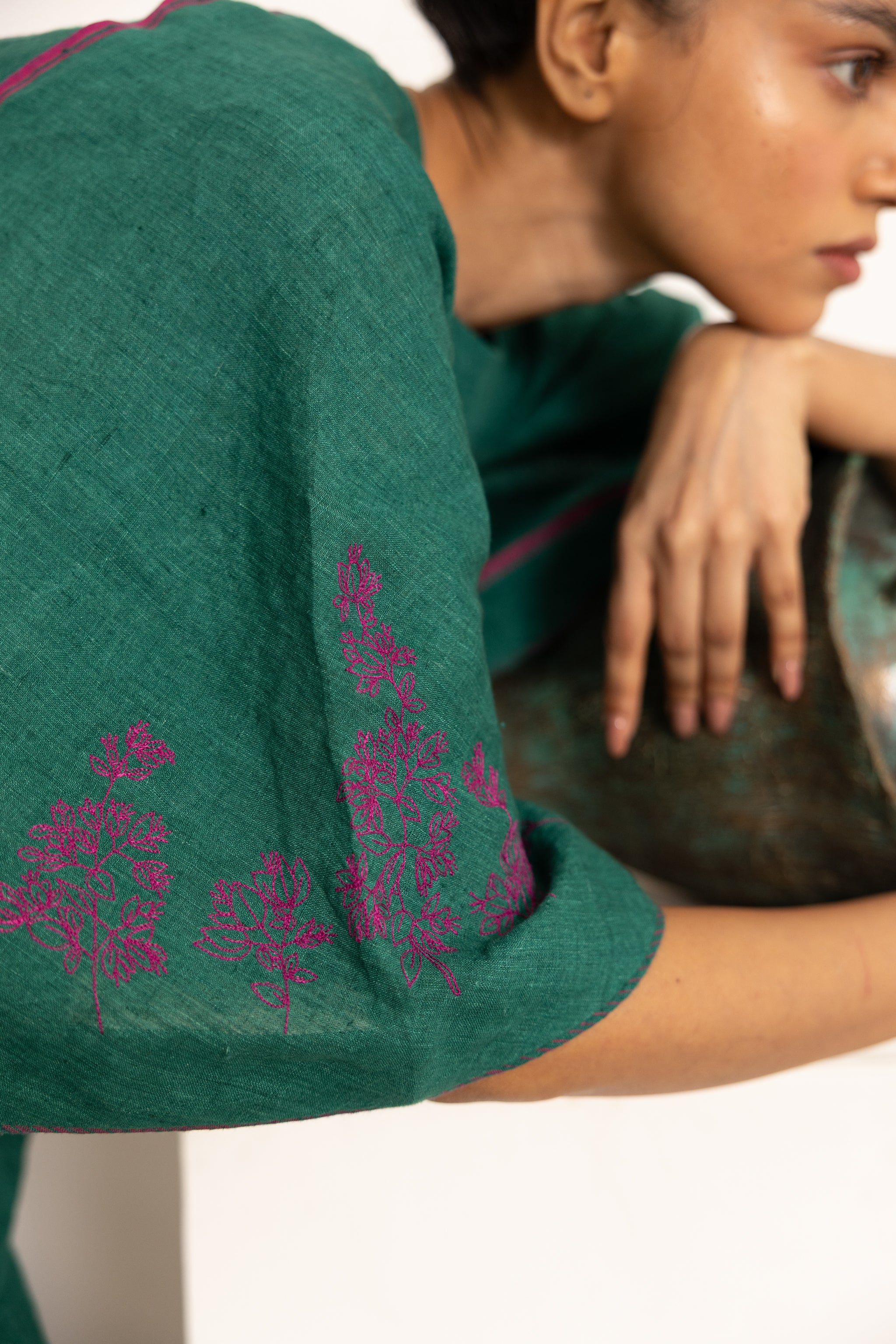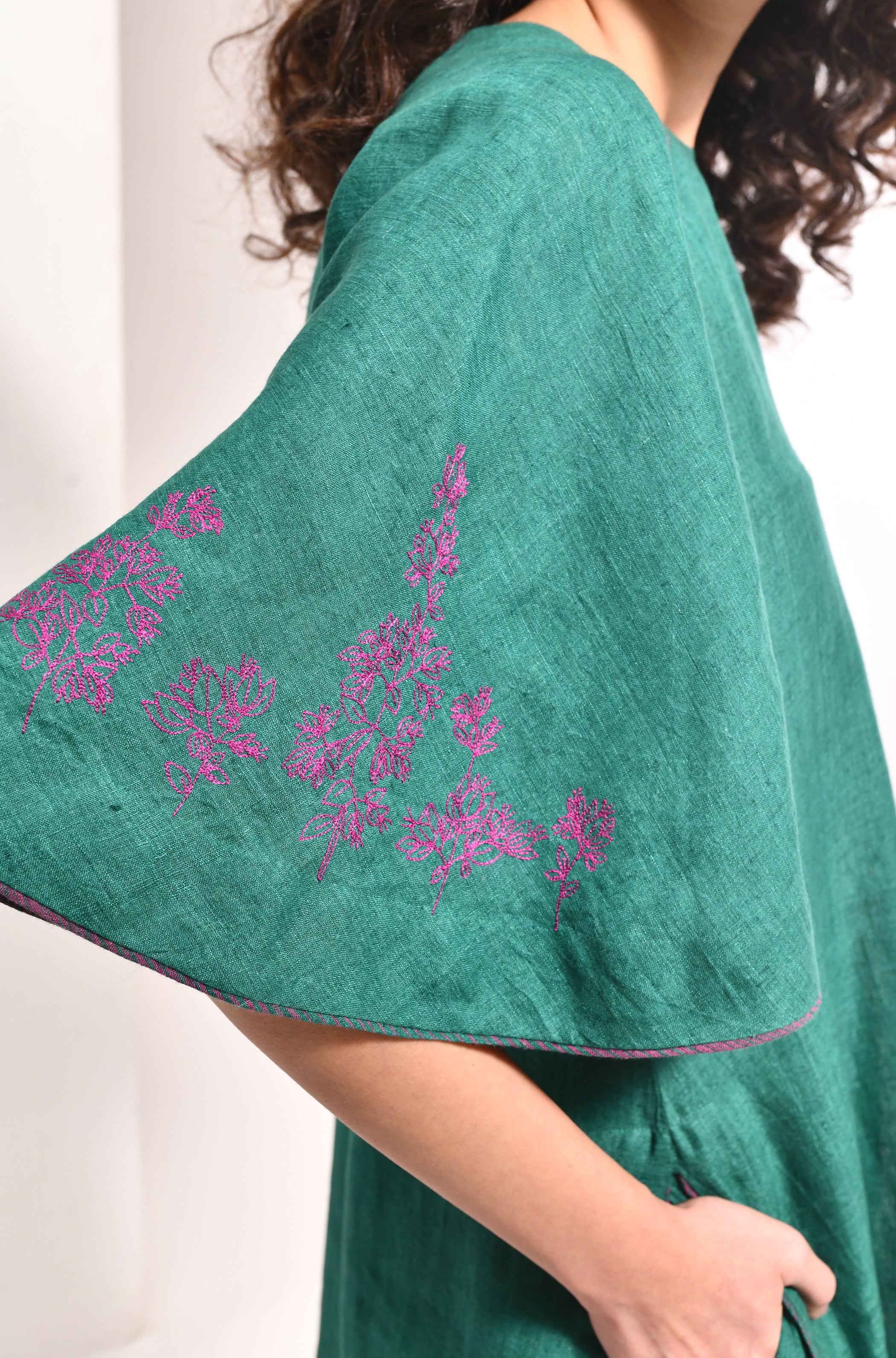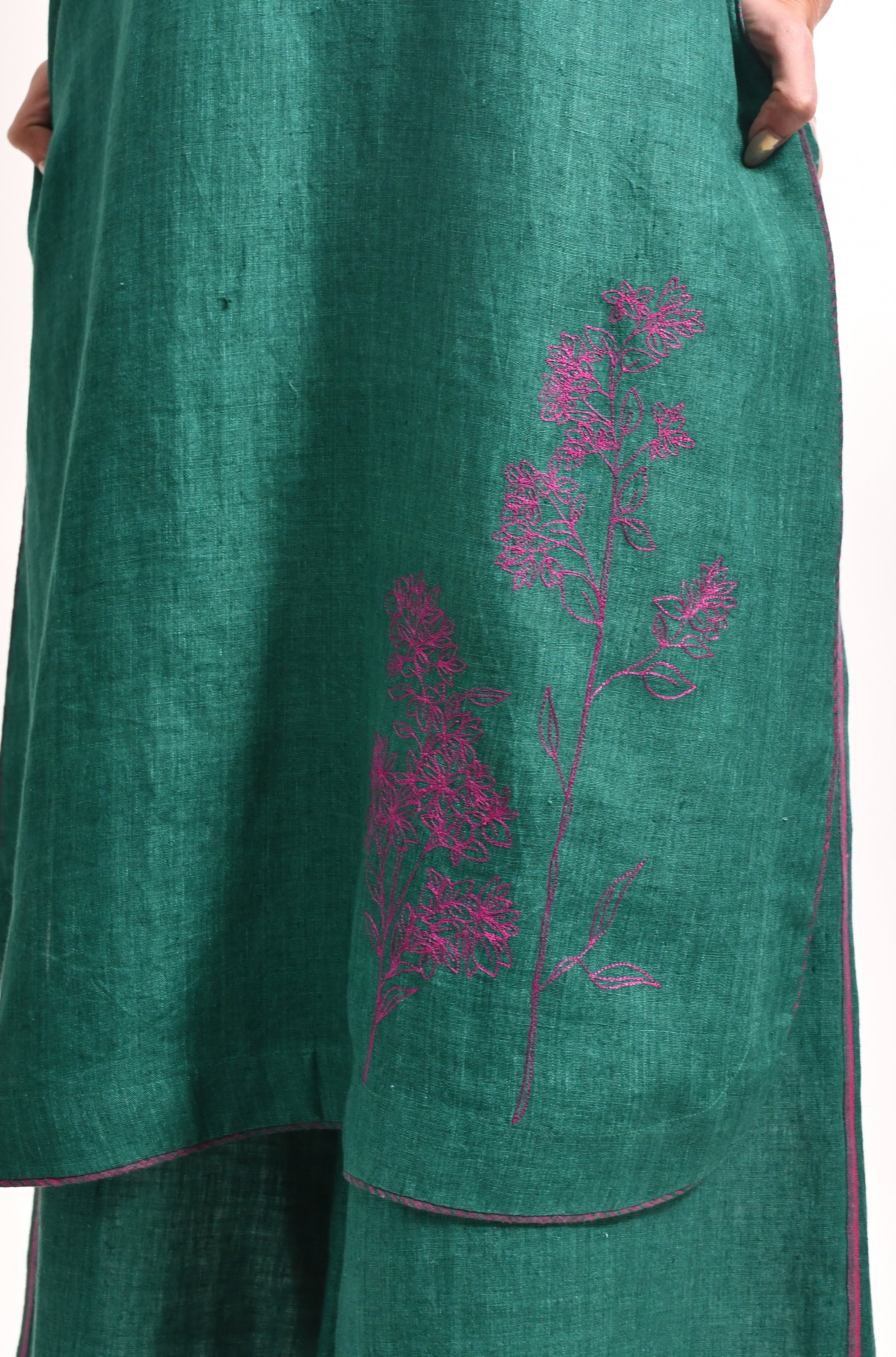 • Linen with solid base with front and back bougainvillea embroidery