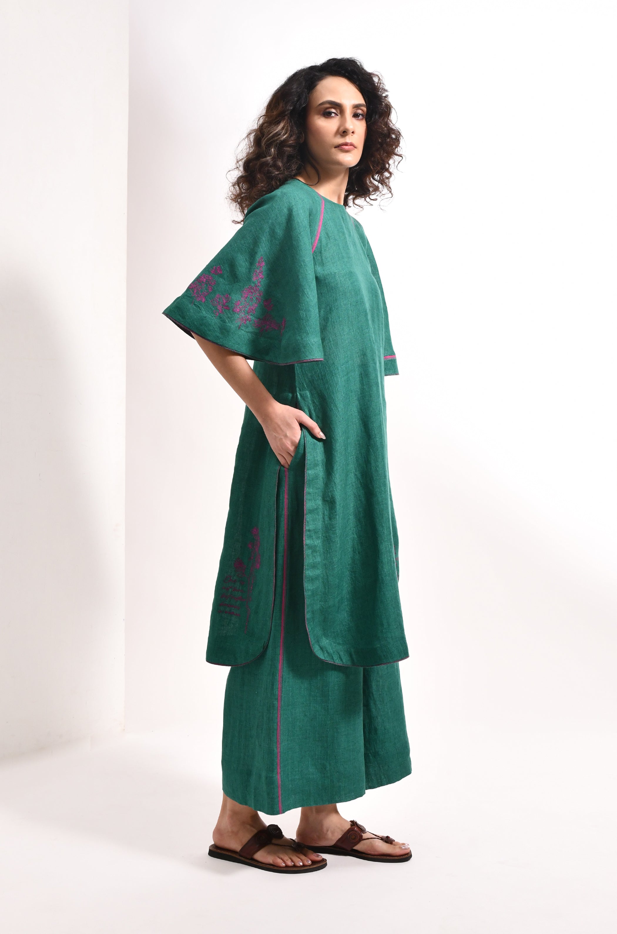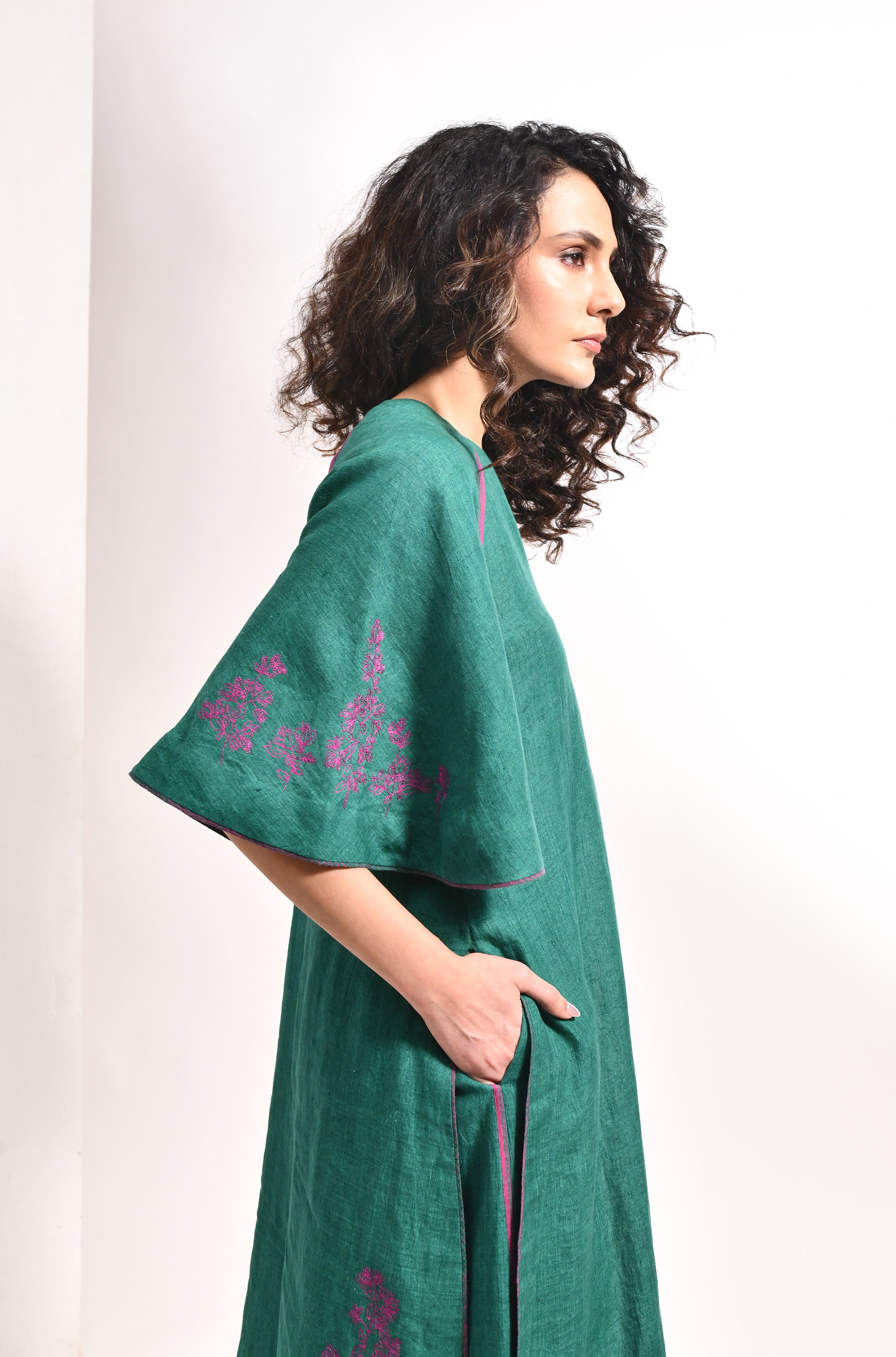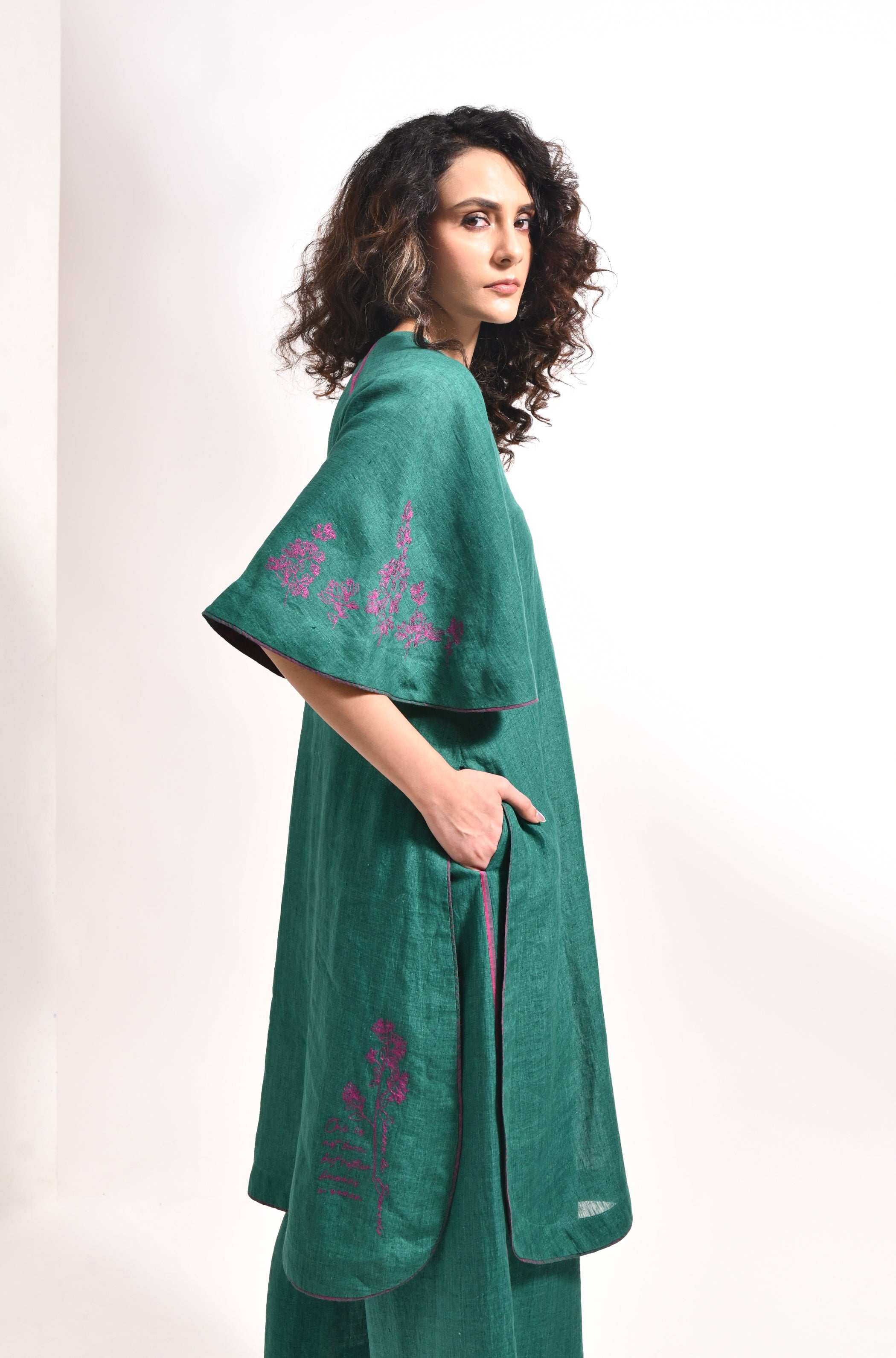 • Linen with solid base with front and back bougainvillea embroidery