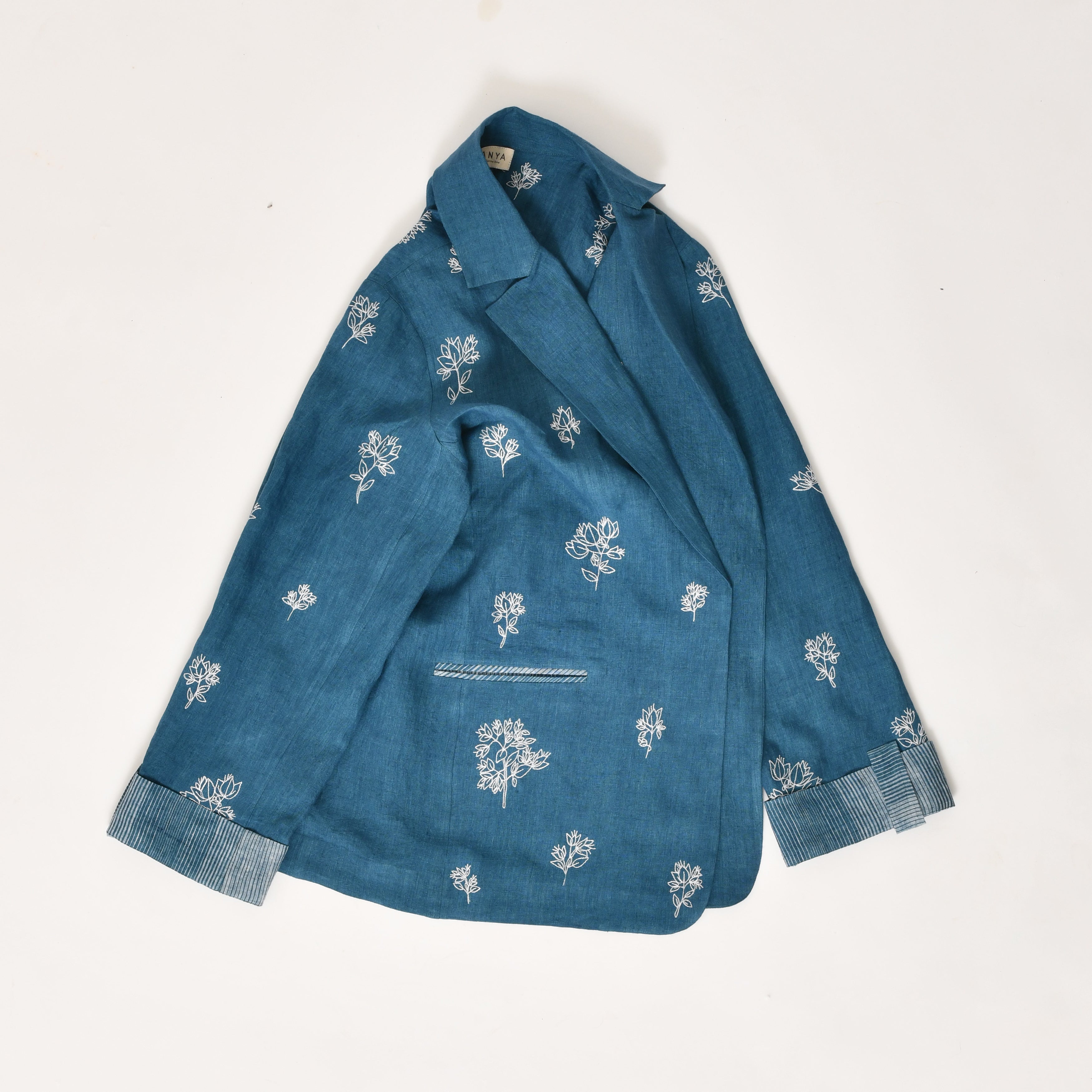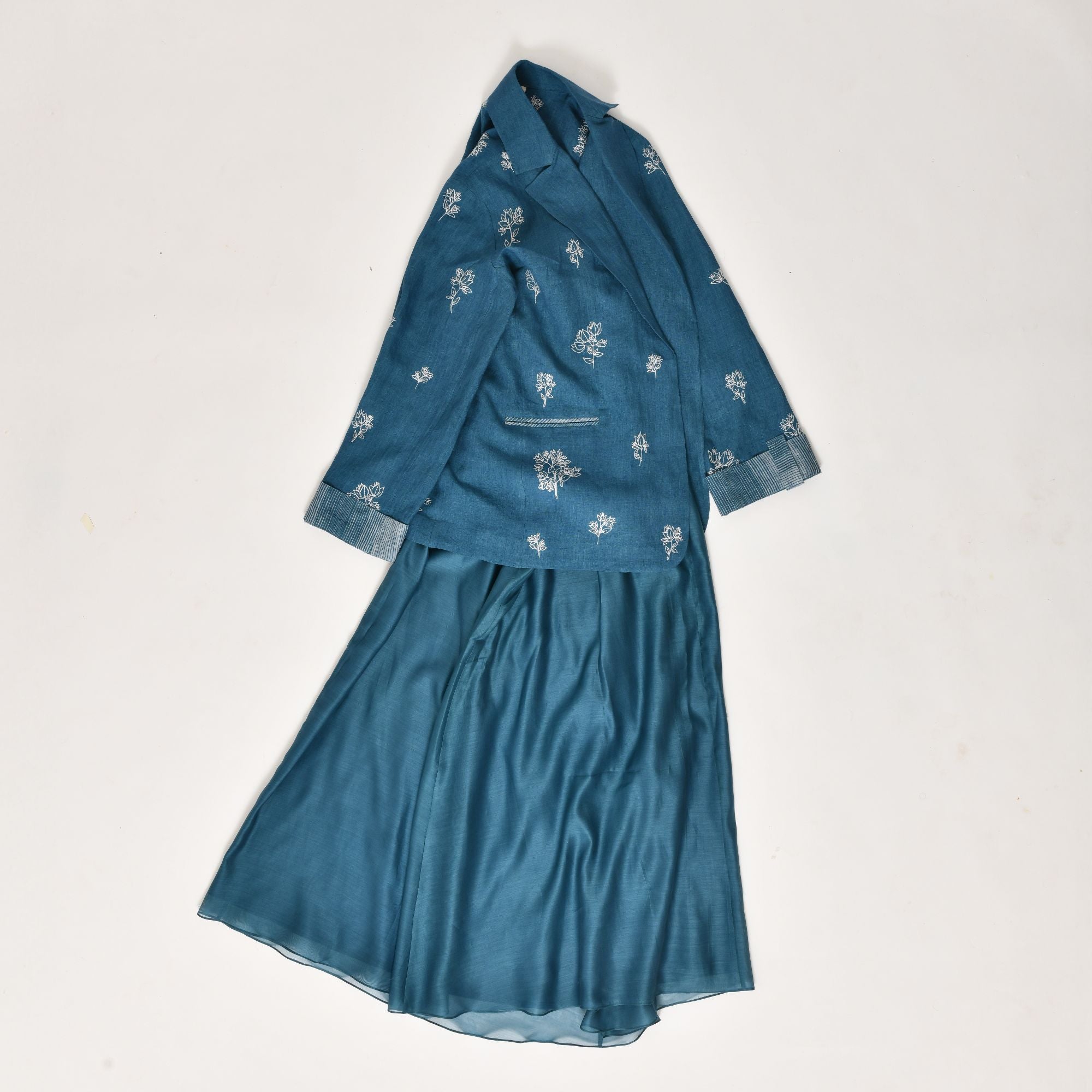 Silk and linen in dialogue — a chanderi strap dress with bold contrast straps, layered under a linen blazer embroidered in bougainvillea, like strength blooming across canvas.