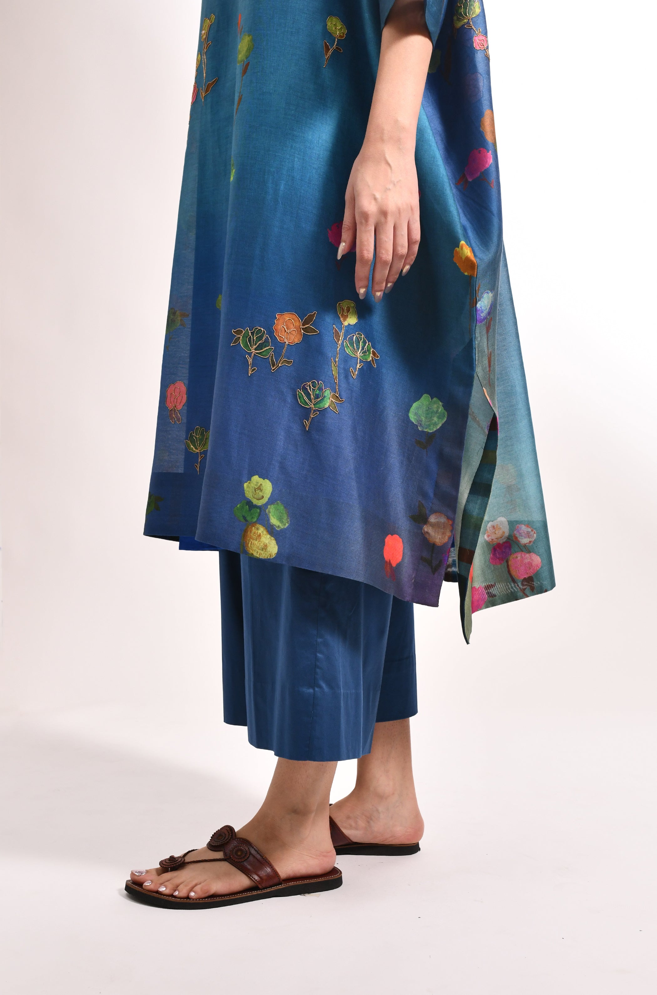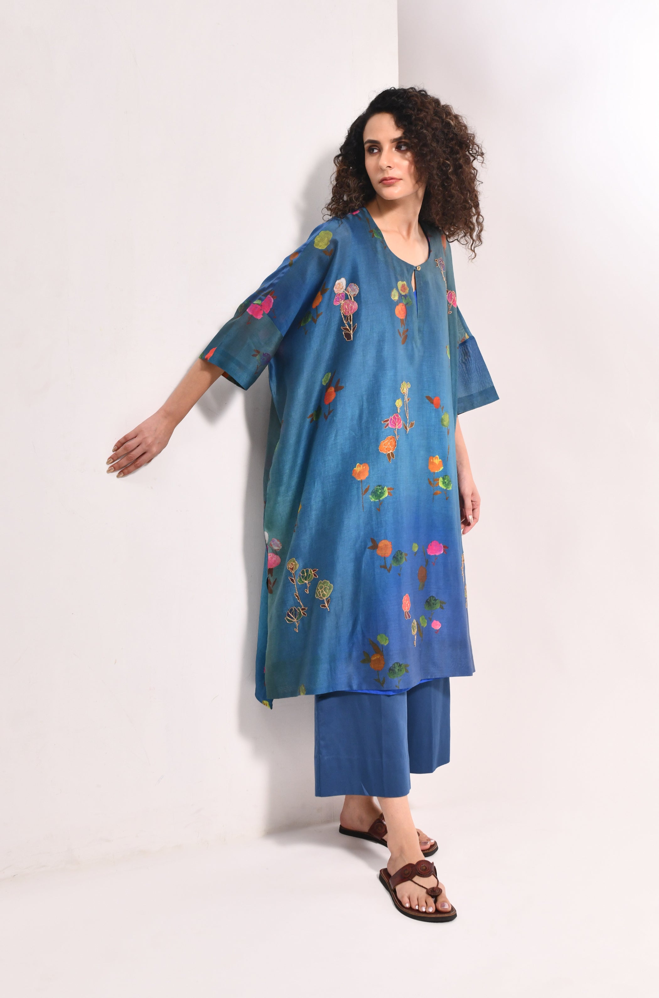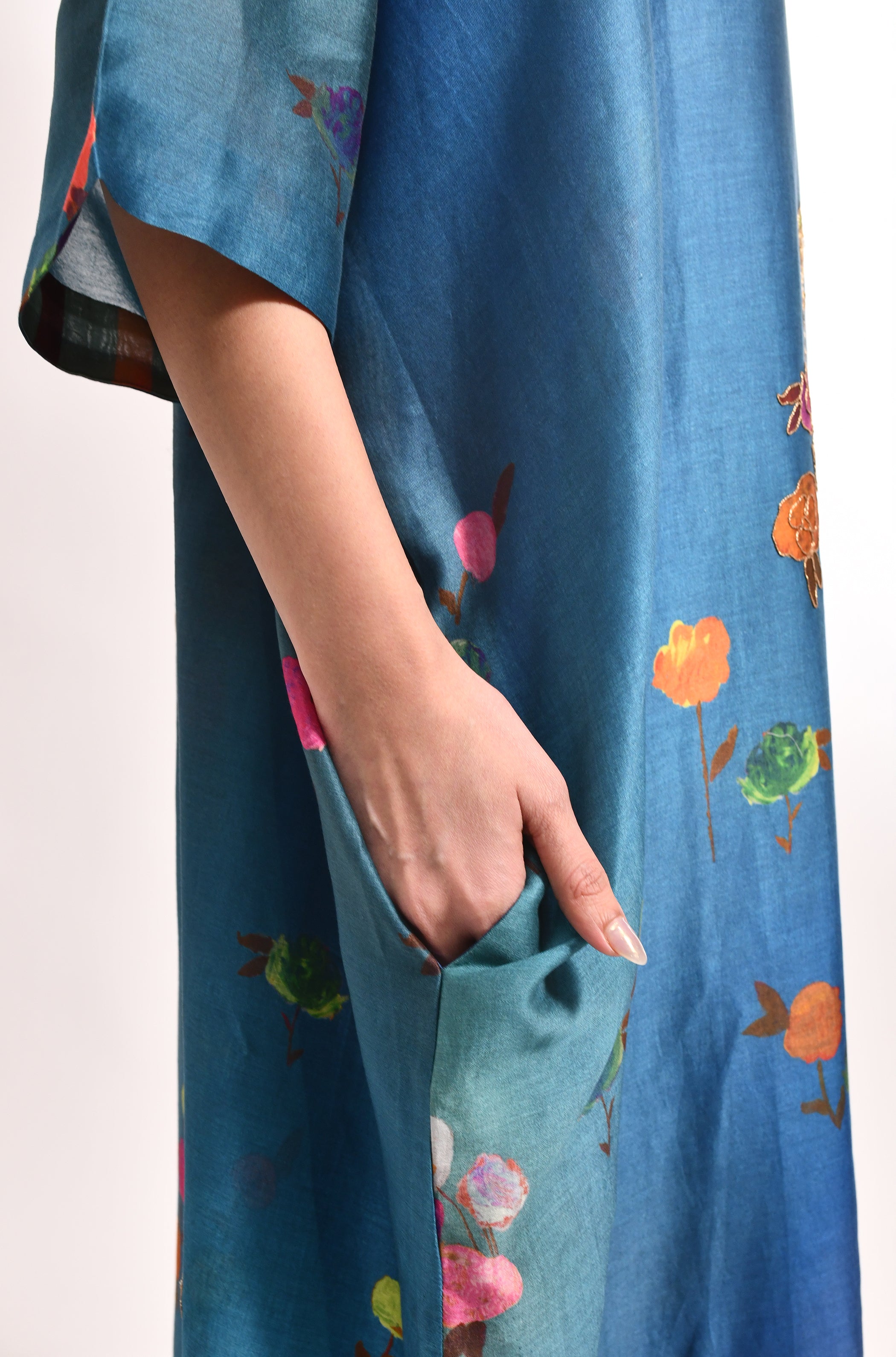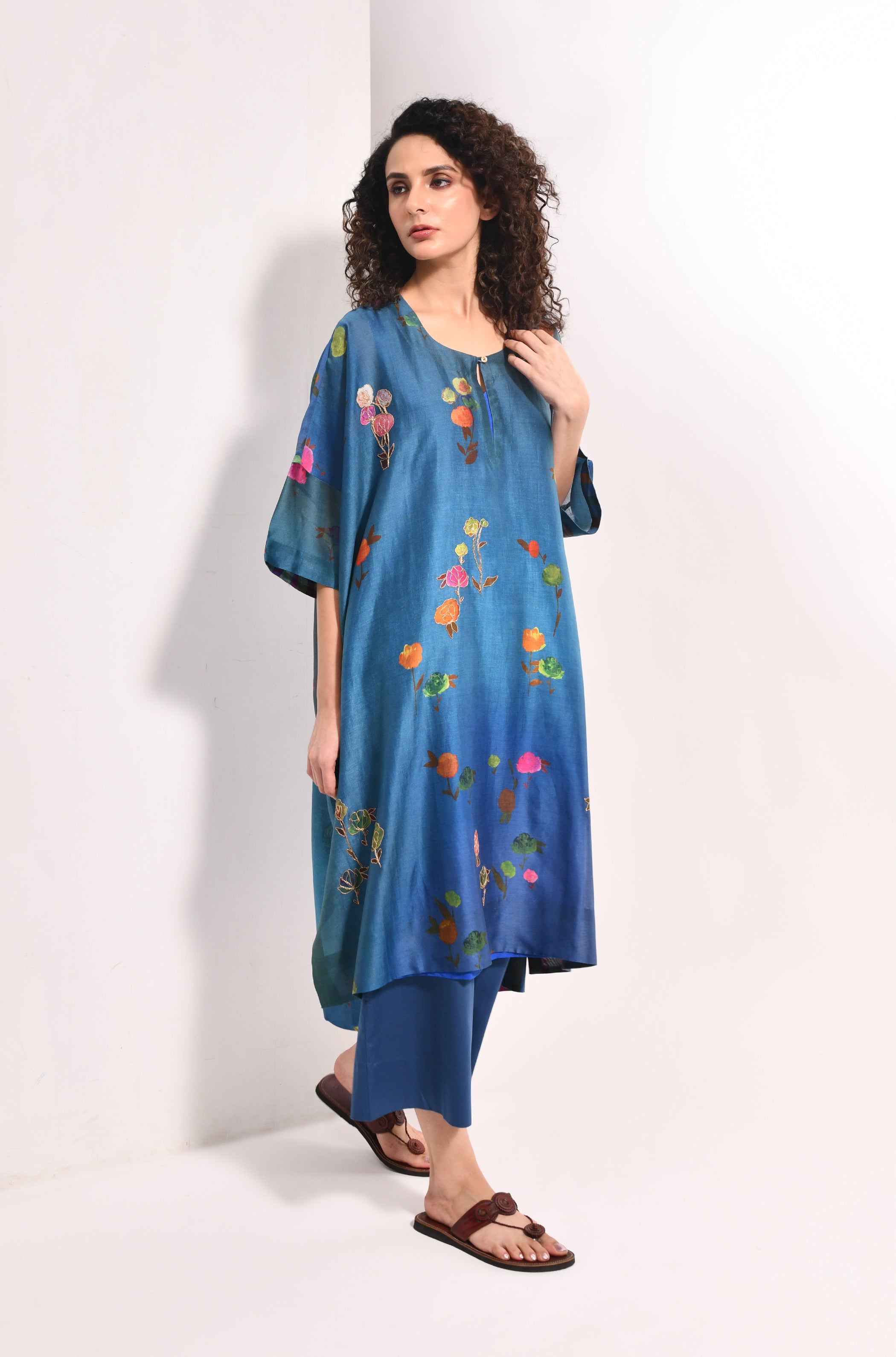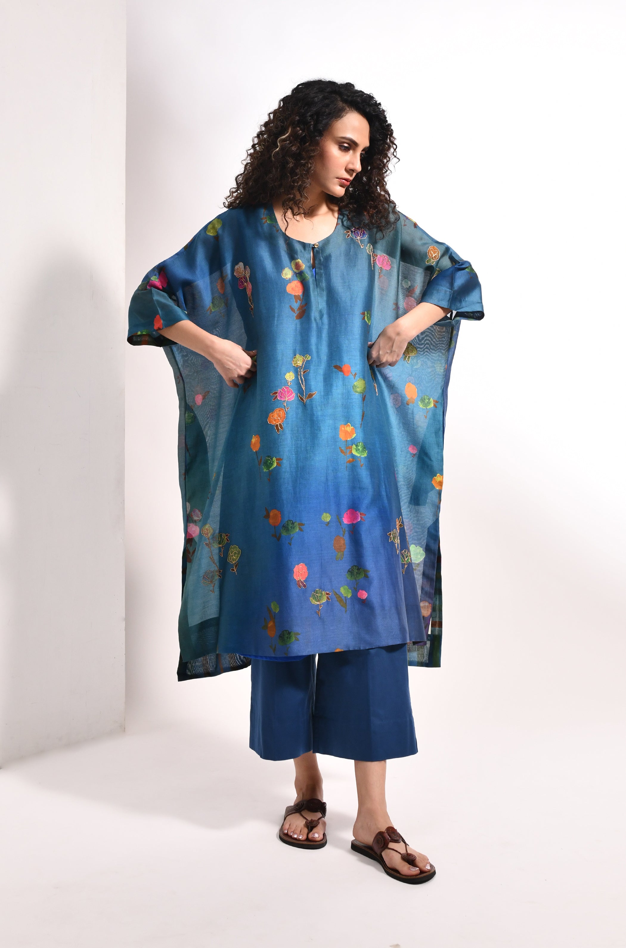 Where calm meets conviction — florals unfurl against luminous royal blue, a kaftan paired with cotton silk trousers. Gloria’s spirit threads through — grounded, luminous, quietly fierce.