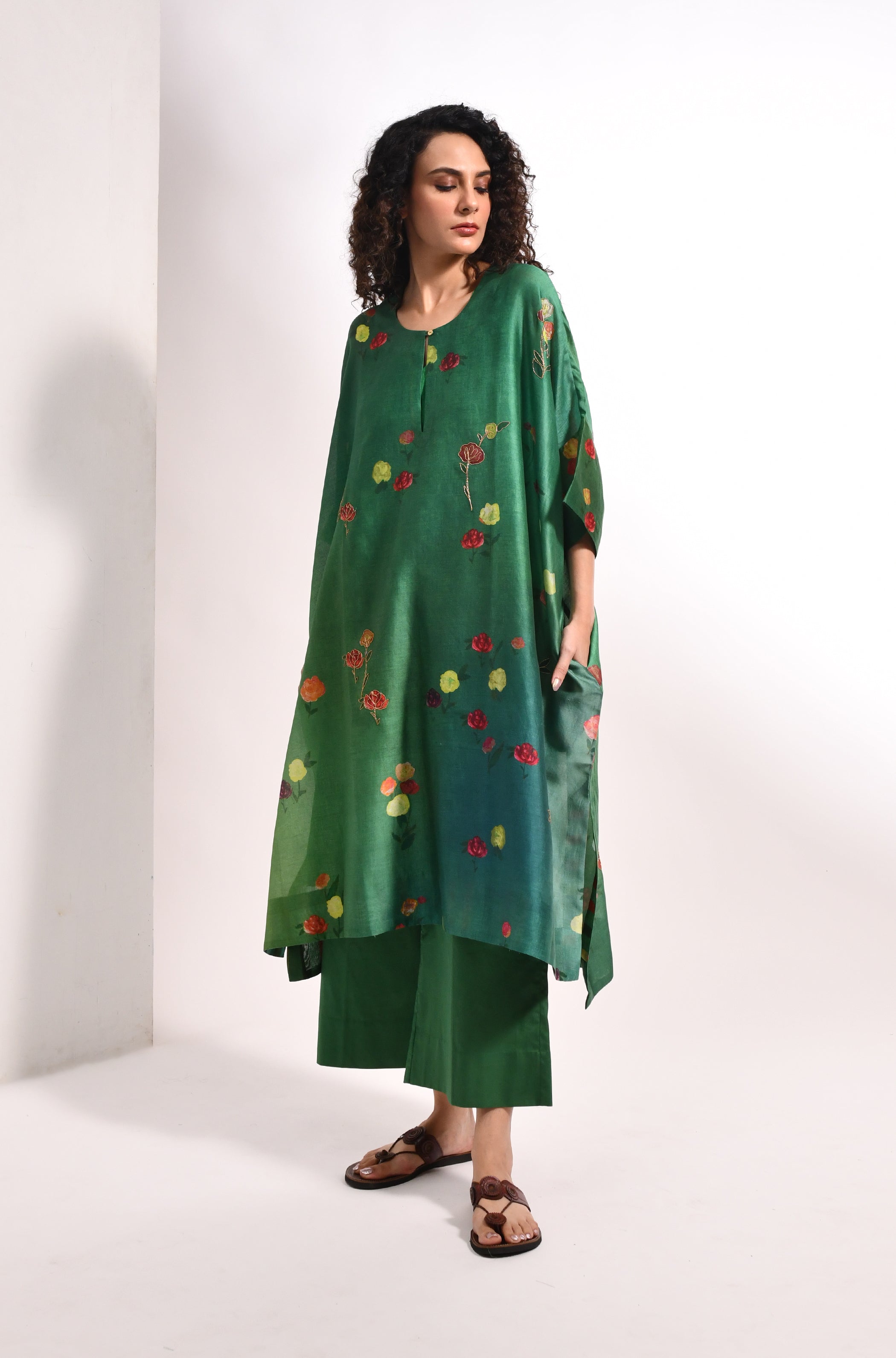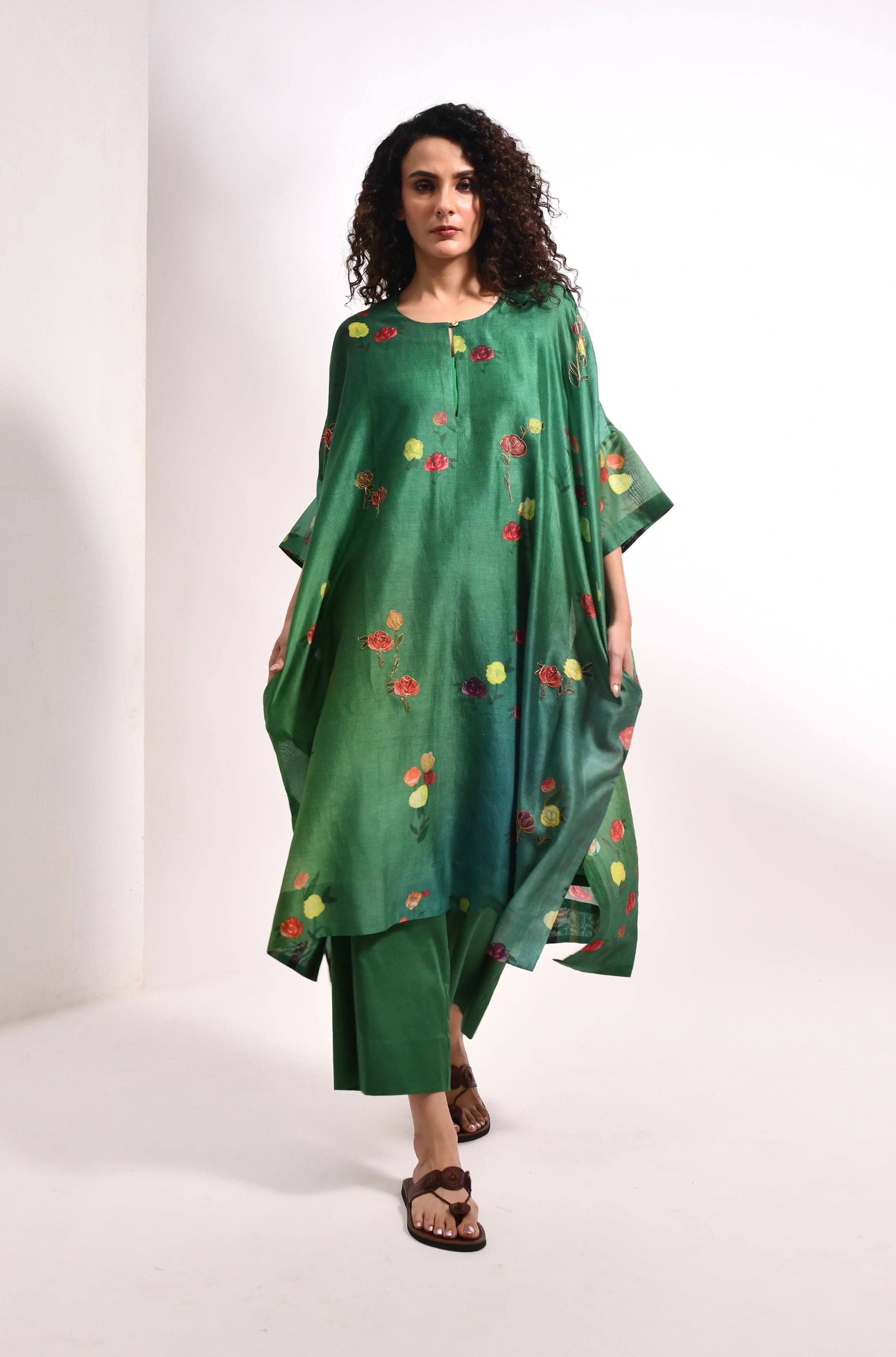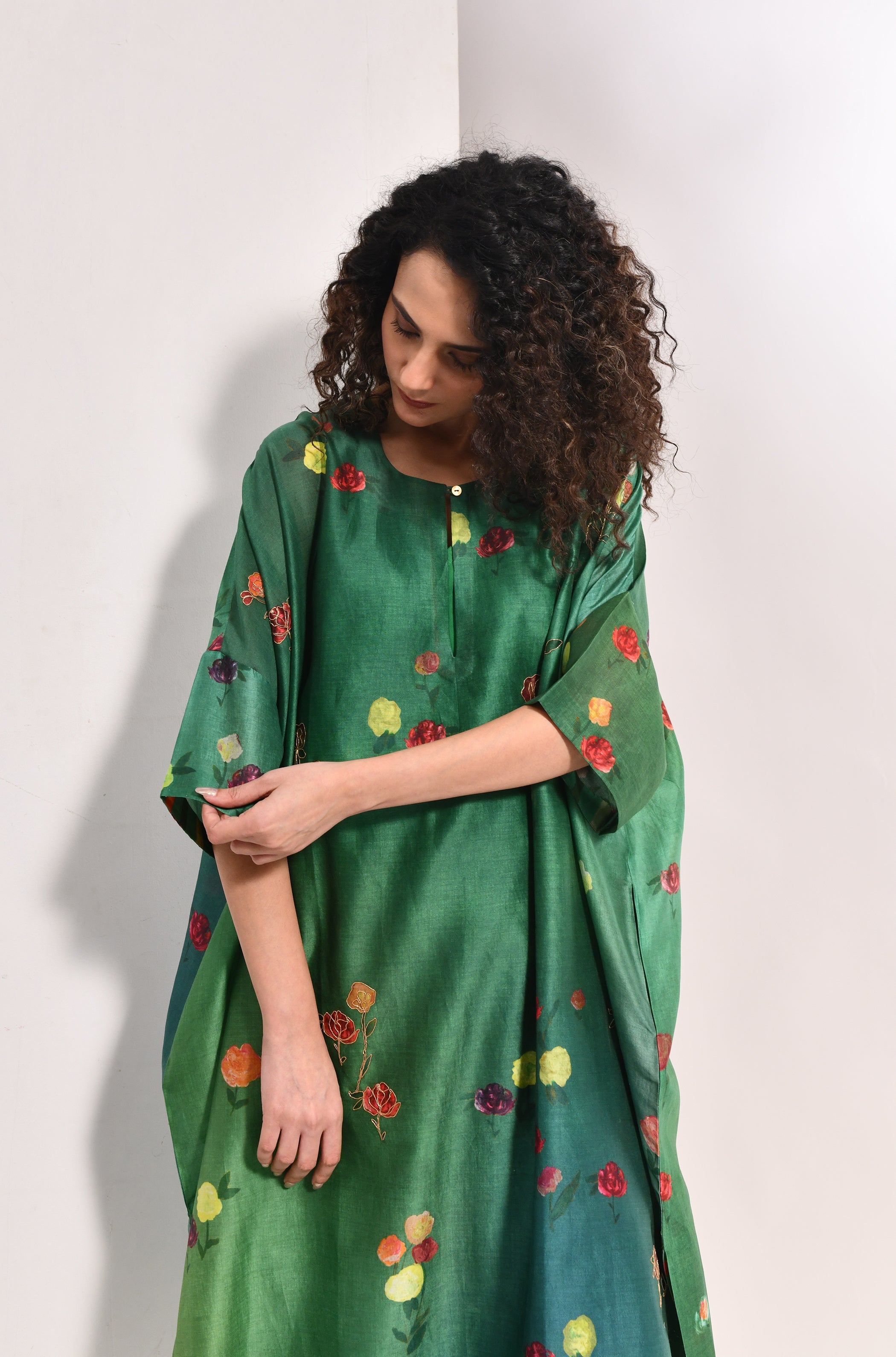 Where calm meets conviction — florals unfurl against emerald green, a kaftan paired with cotton silk trousers. Gloria’s spirit threads through — grounded, luminous, quietly fierce.