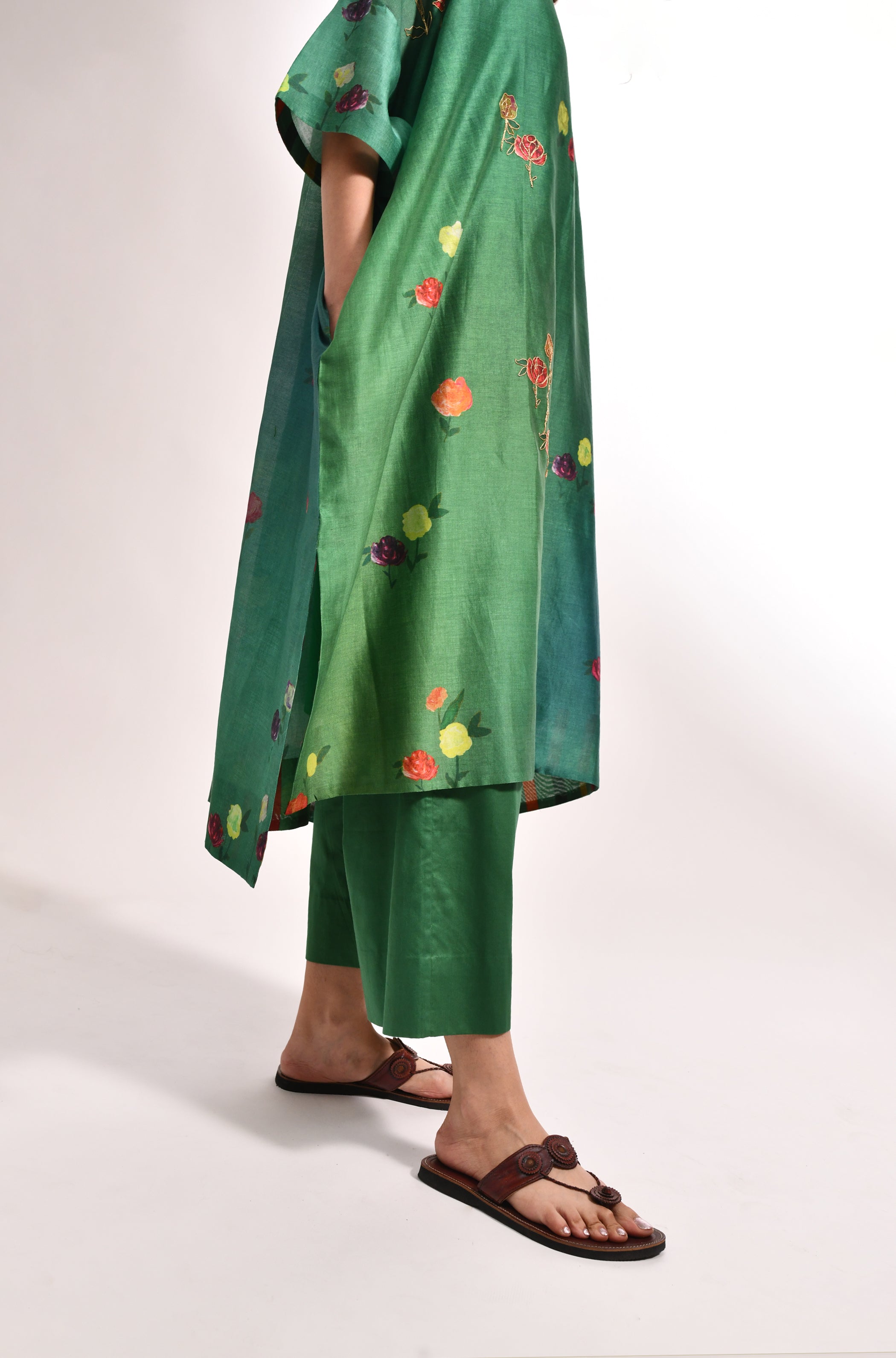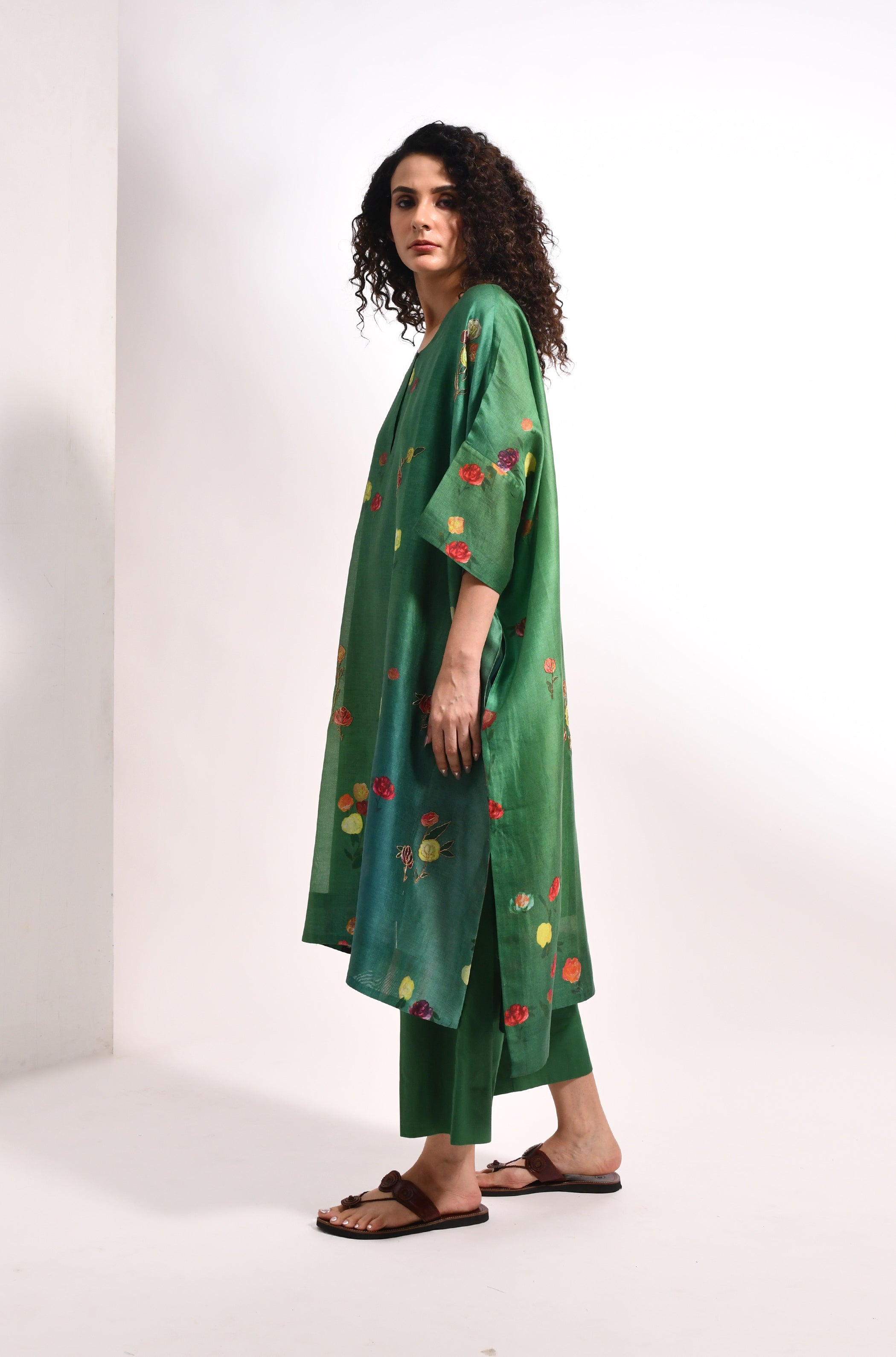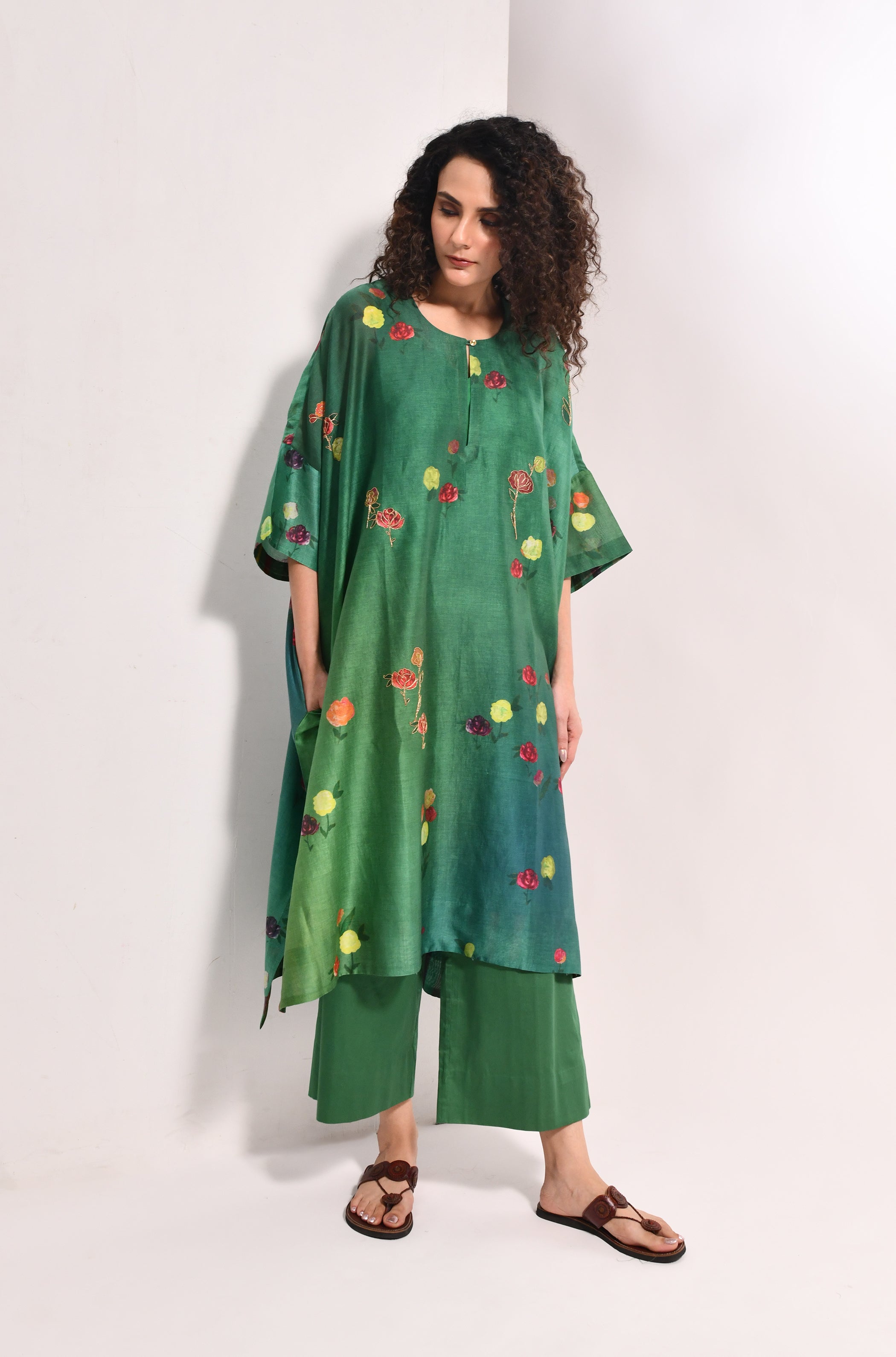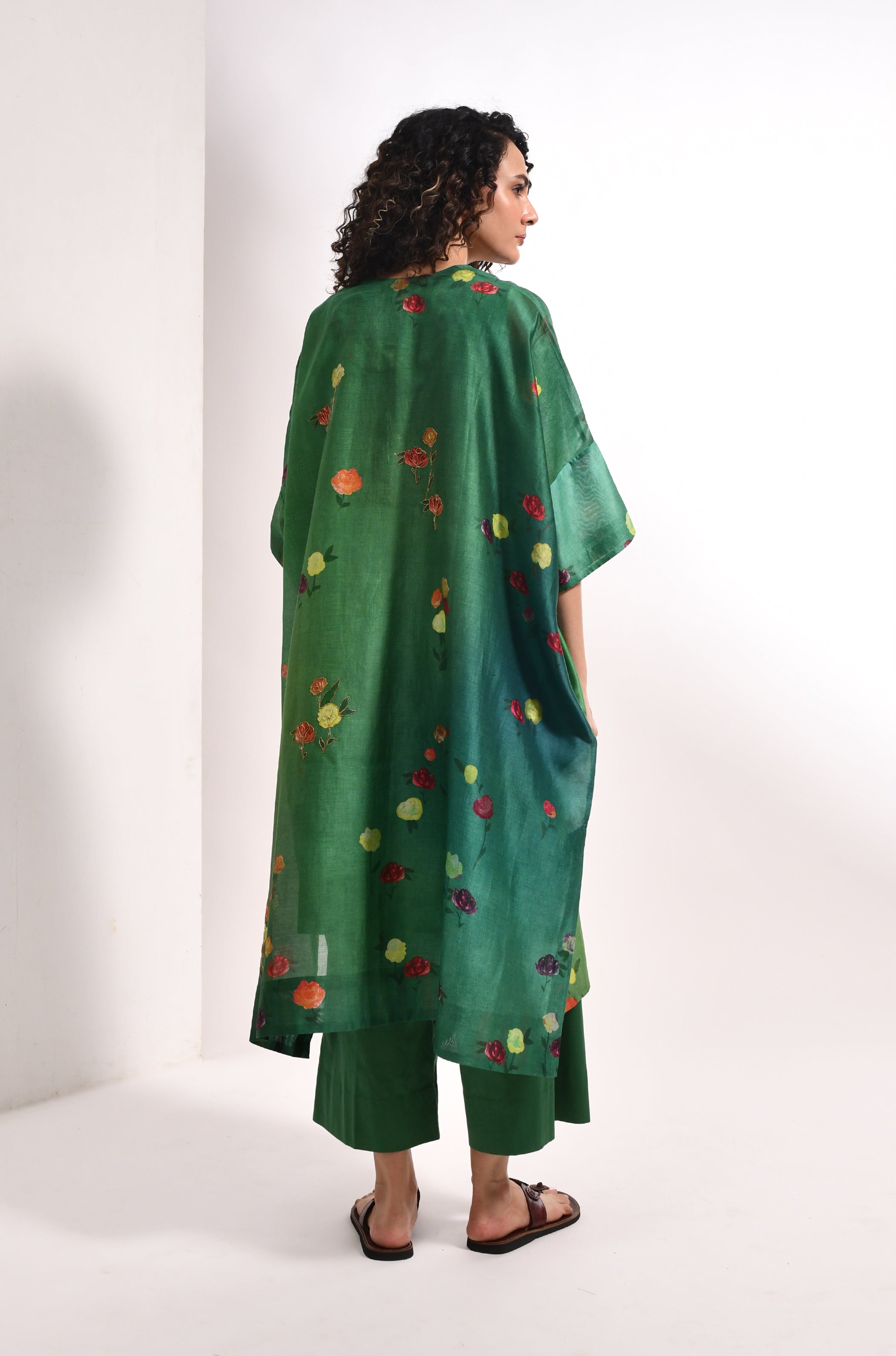 Where calm meets conviction — florals unfurl against emerald green, a kaftan paired with cotton silk trousers. Gloria’s spirit threads through — grounded, luminous, quietly fierce.