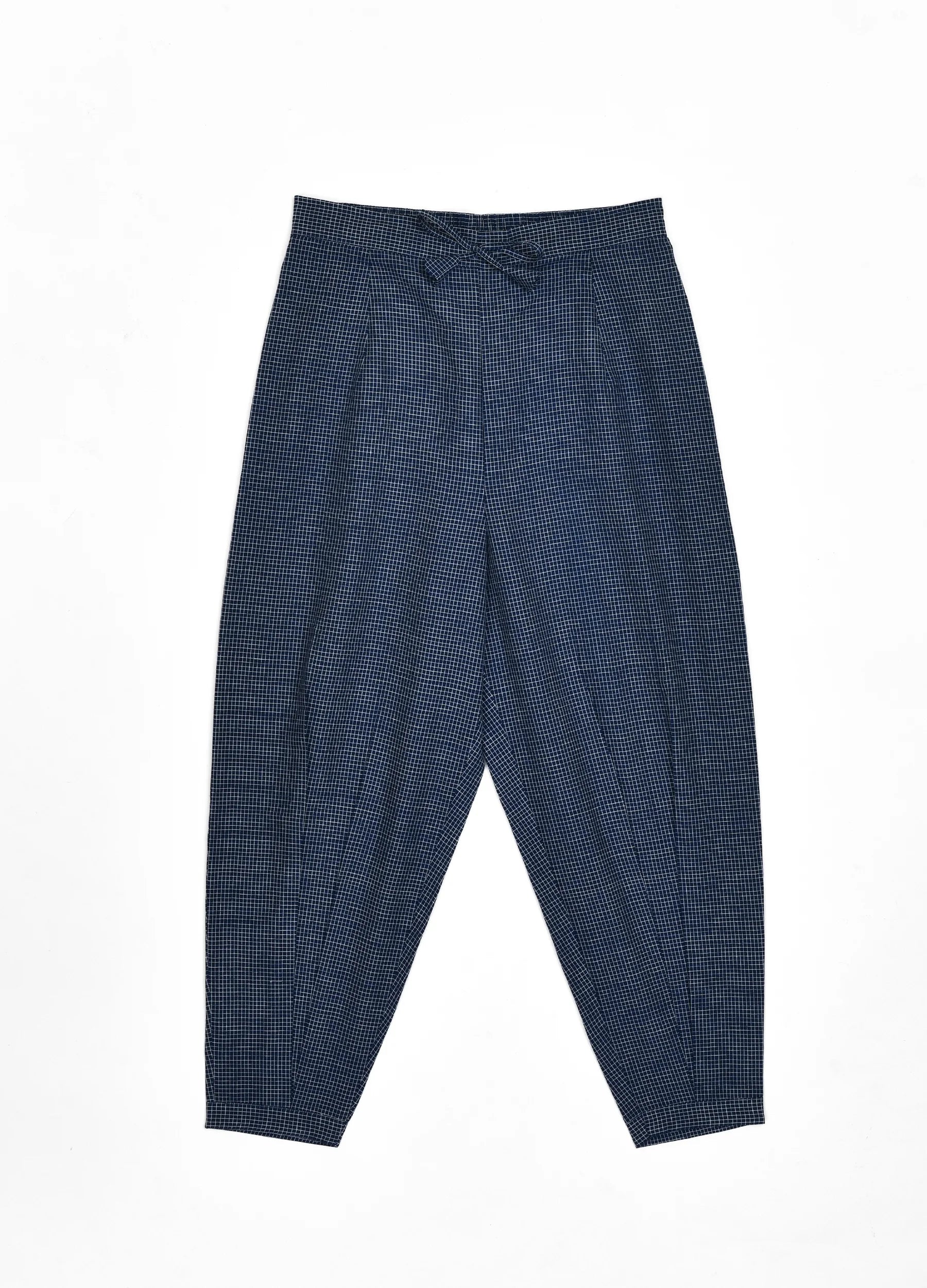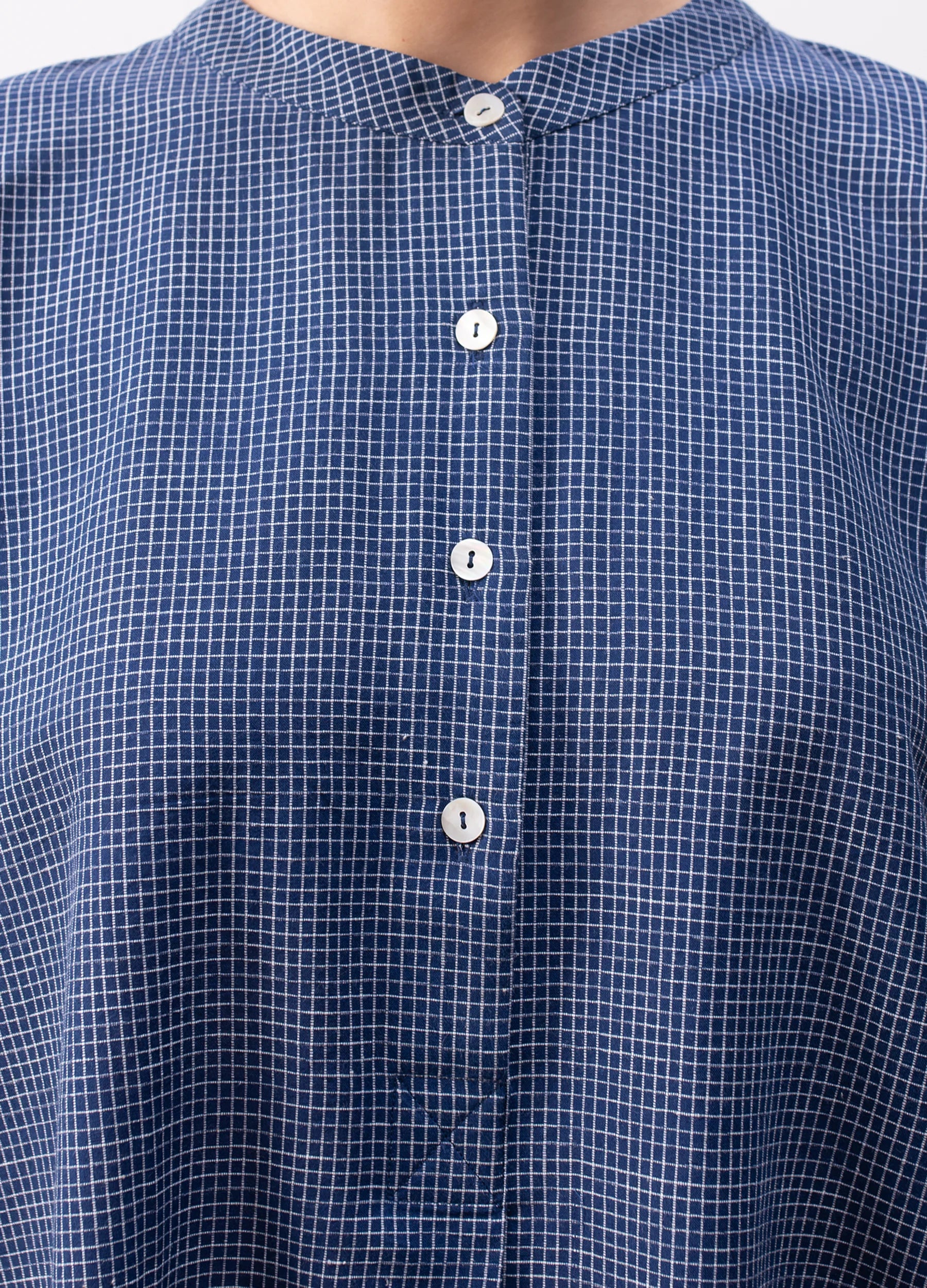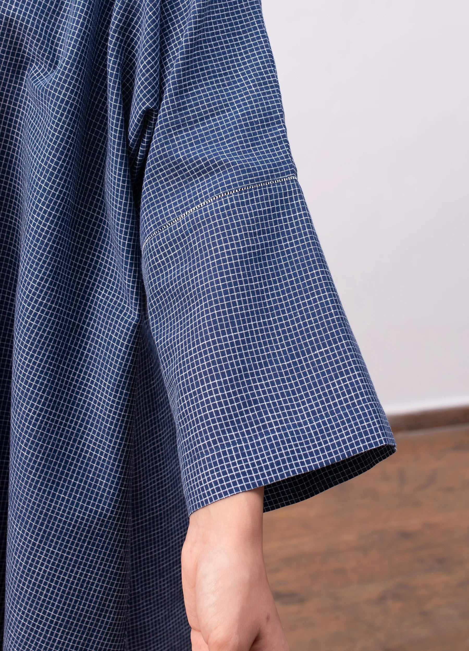 An oversized silhouette in handwoven cotton checks, where contrast lends structure to the form.