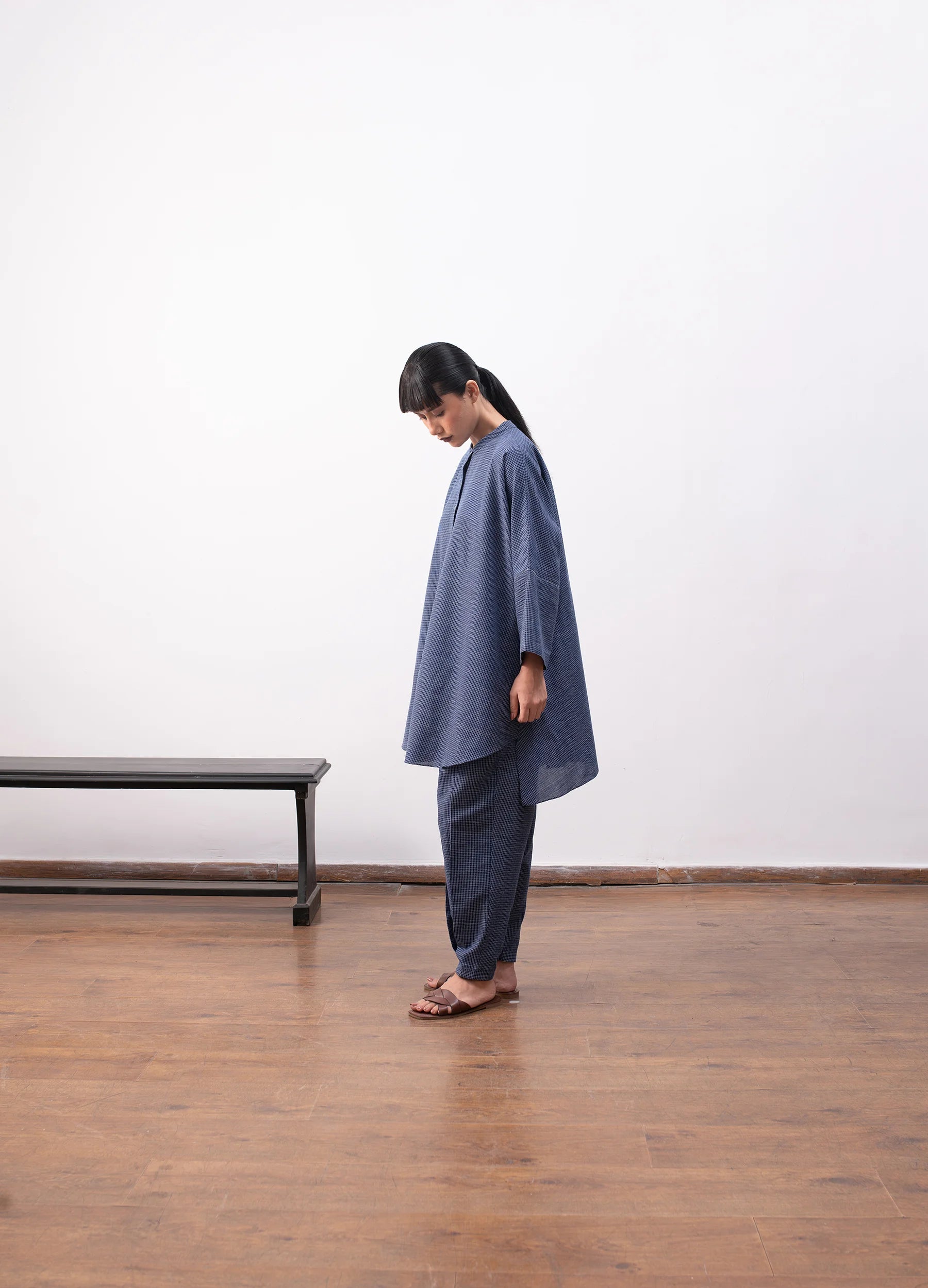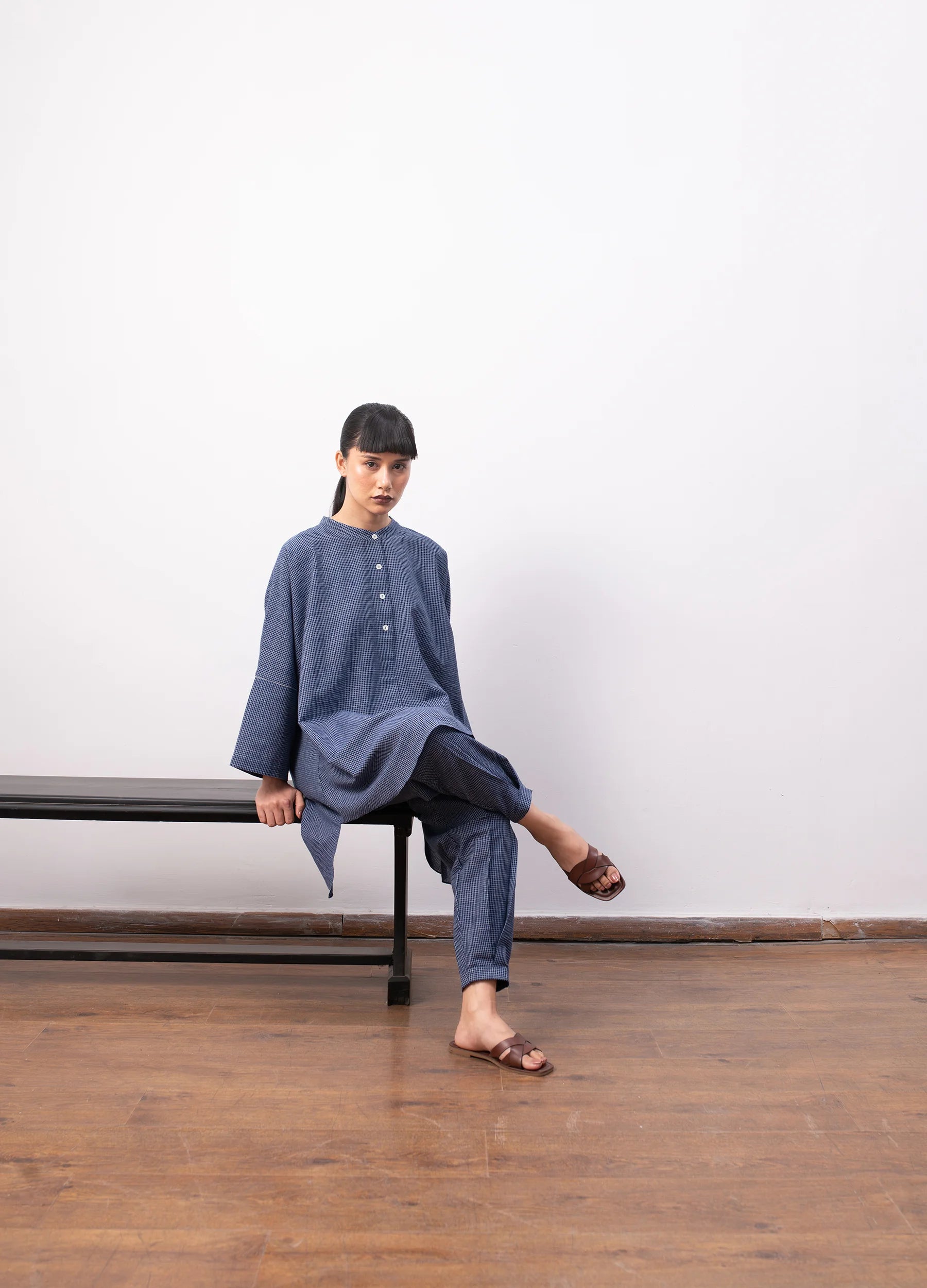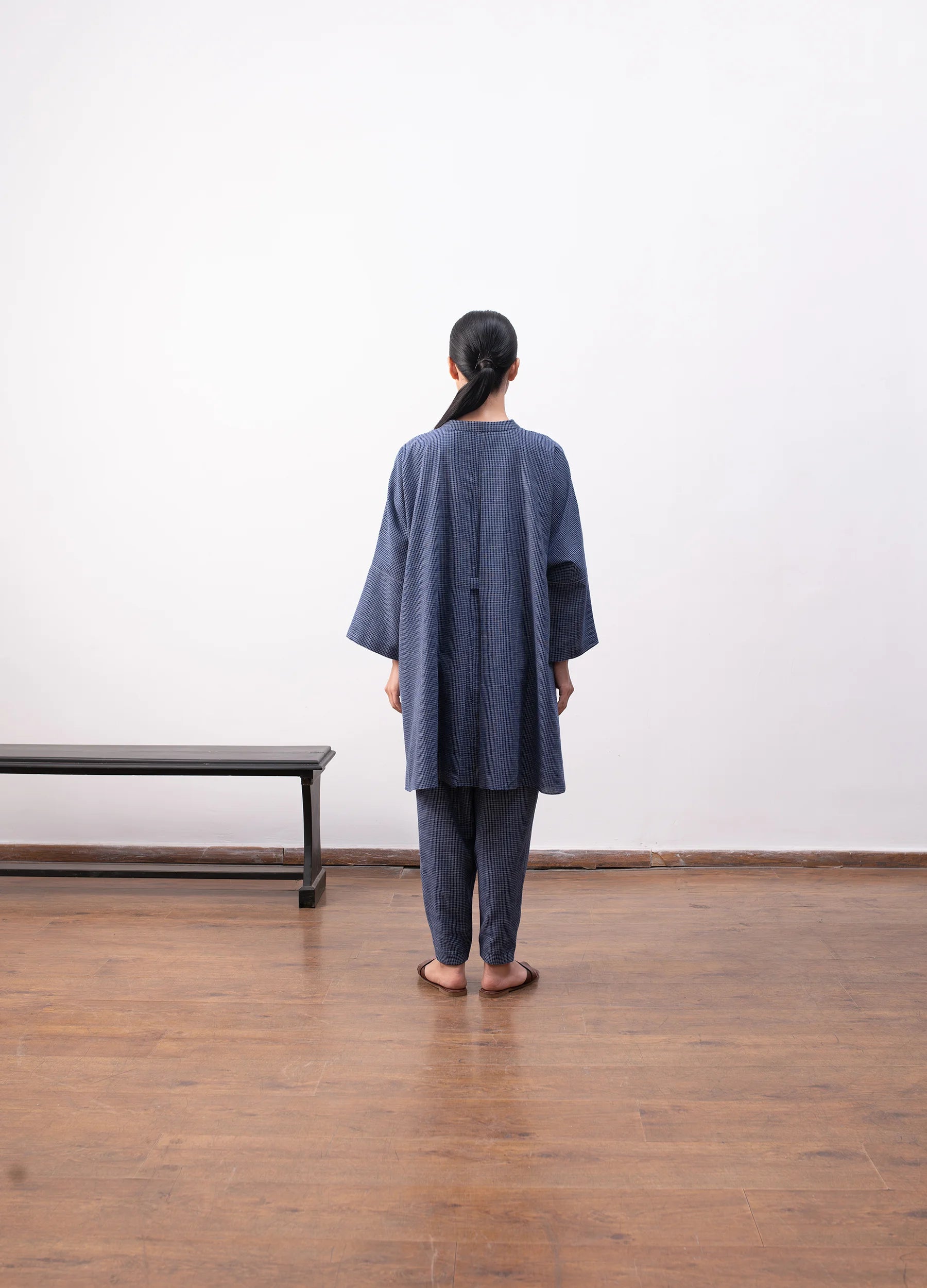 The deep navy base is intersected with fine corded lines, creating a measured texture across the surface. The kurta maintains a clean architectural line, balanced by trousers that taper gently at the hem.