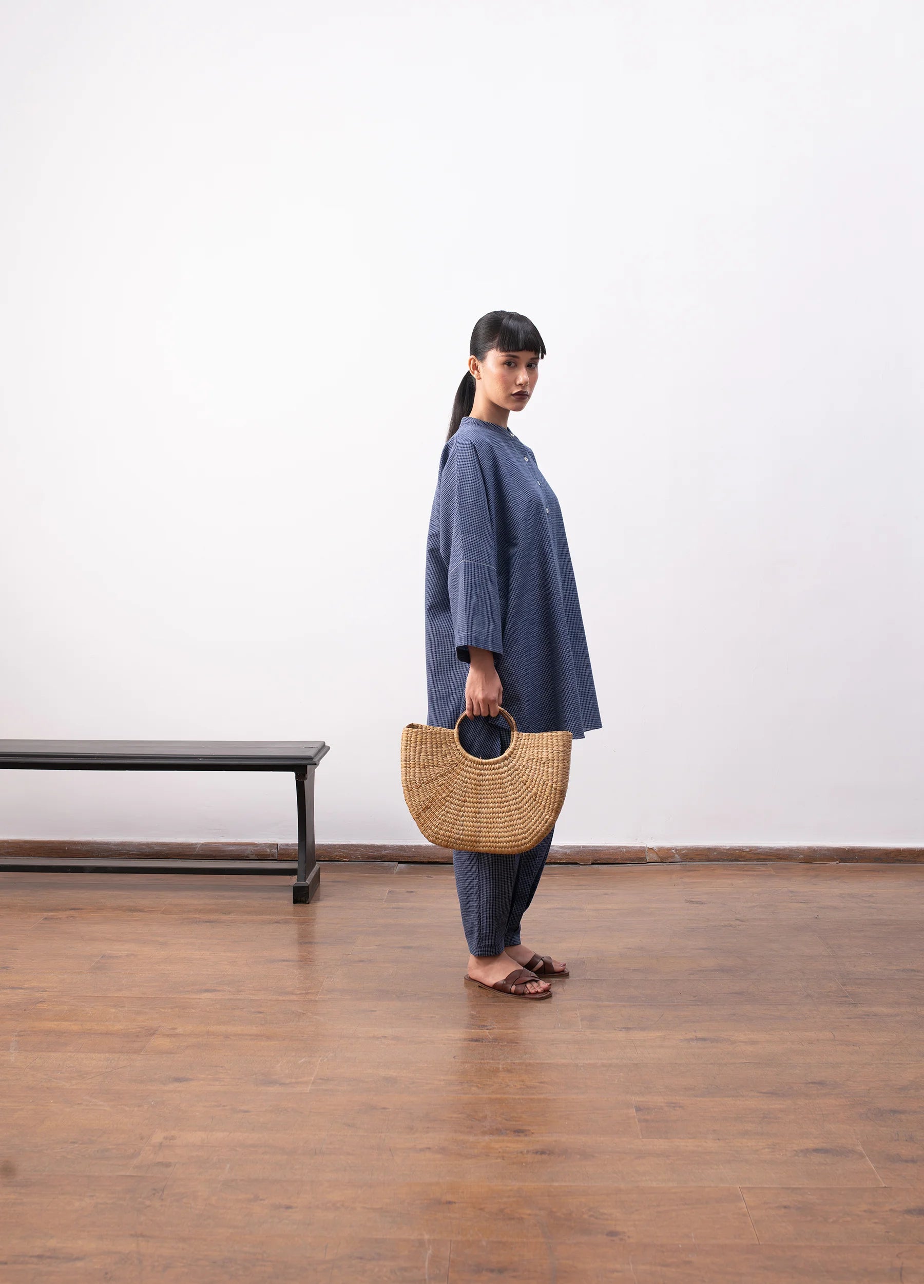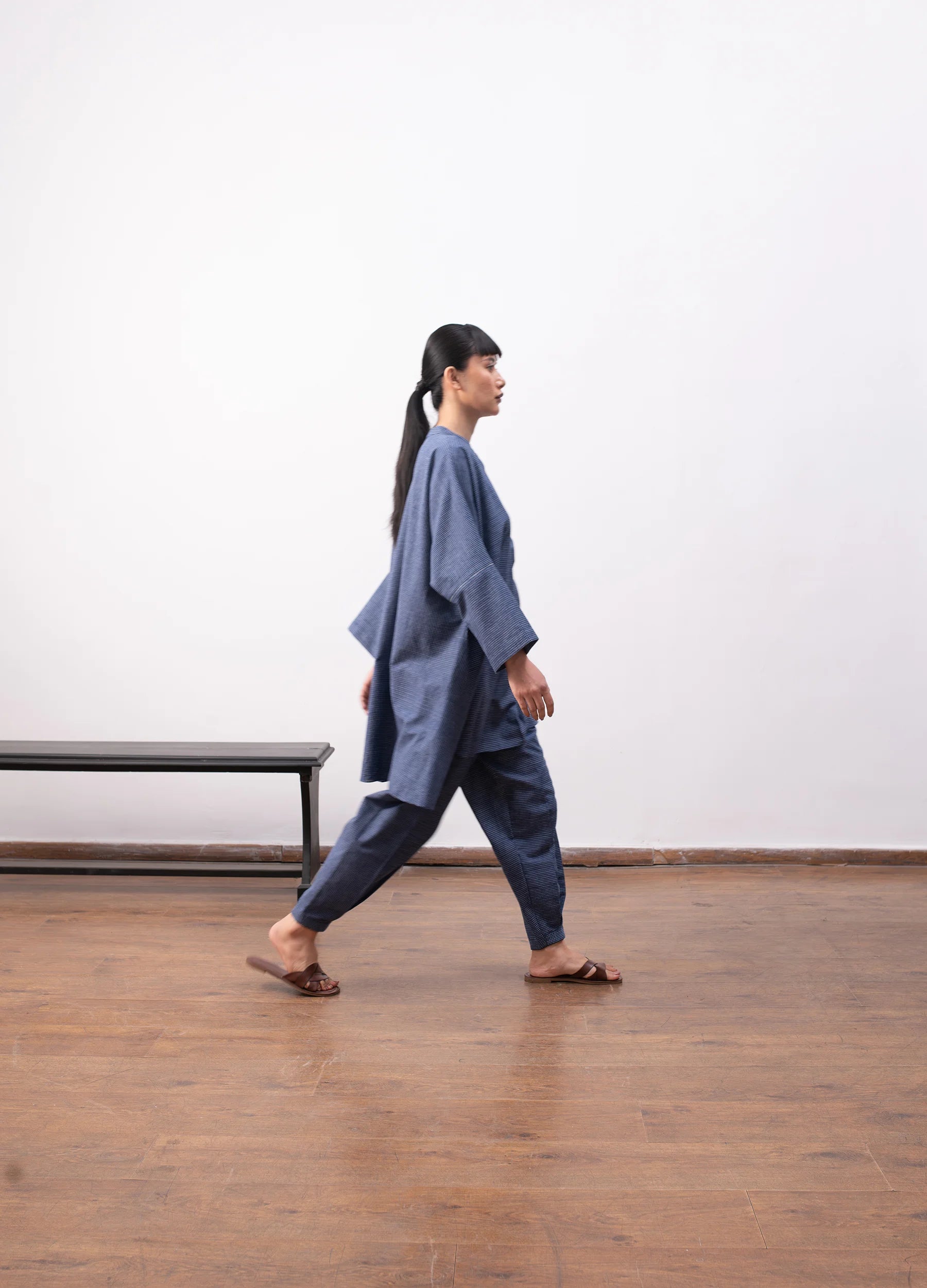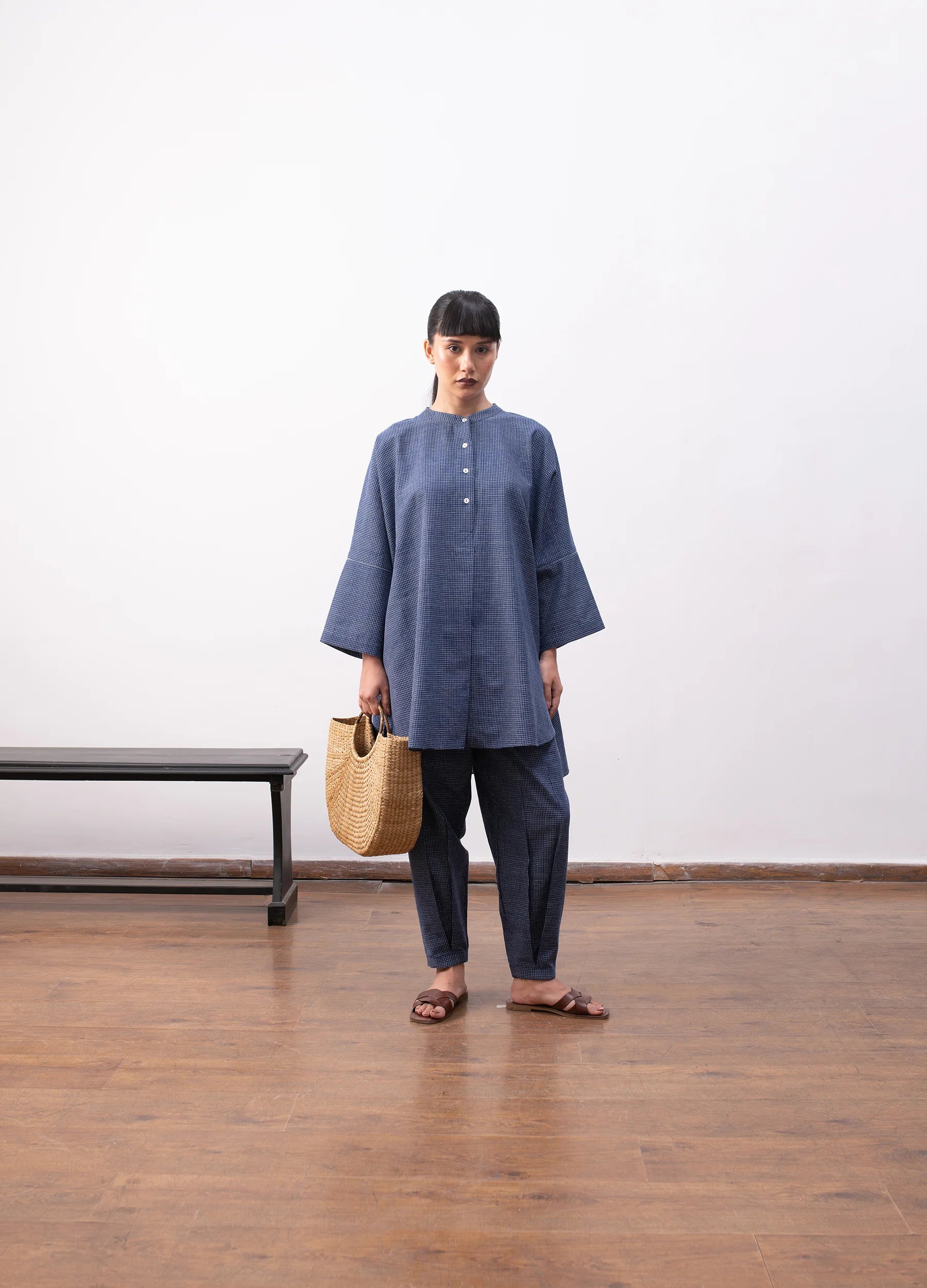 The deep navy base is intersected with fine corded lines, creating a measured texture across the surface. The kurta maintains a clean architectural line, balanced by trousers that taper gently at the hem.