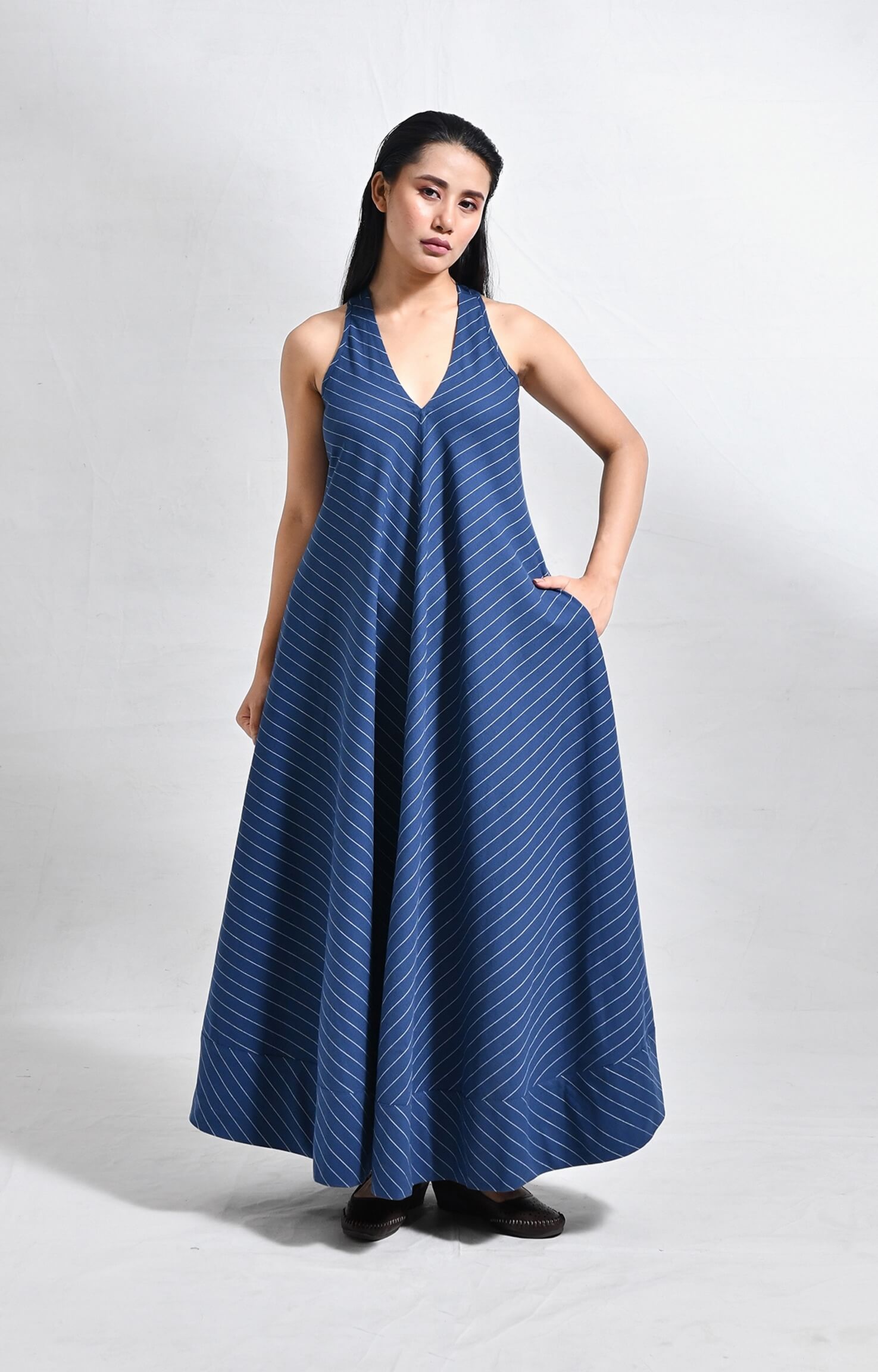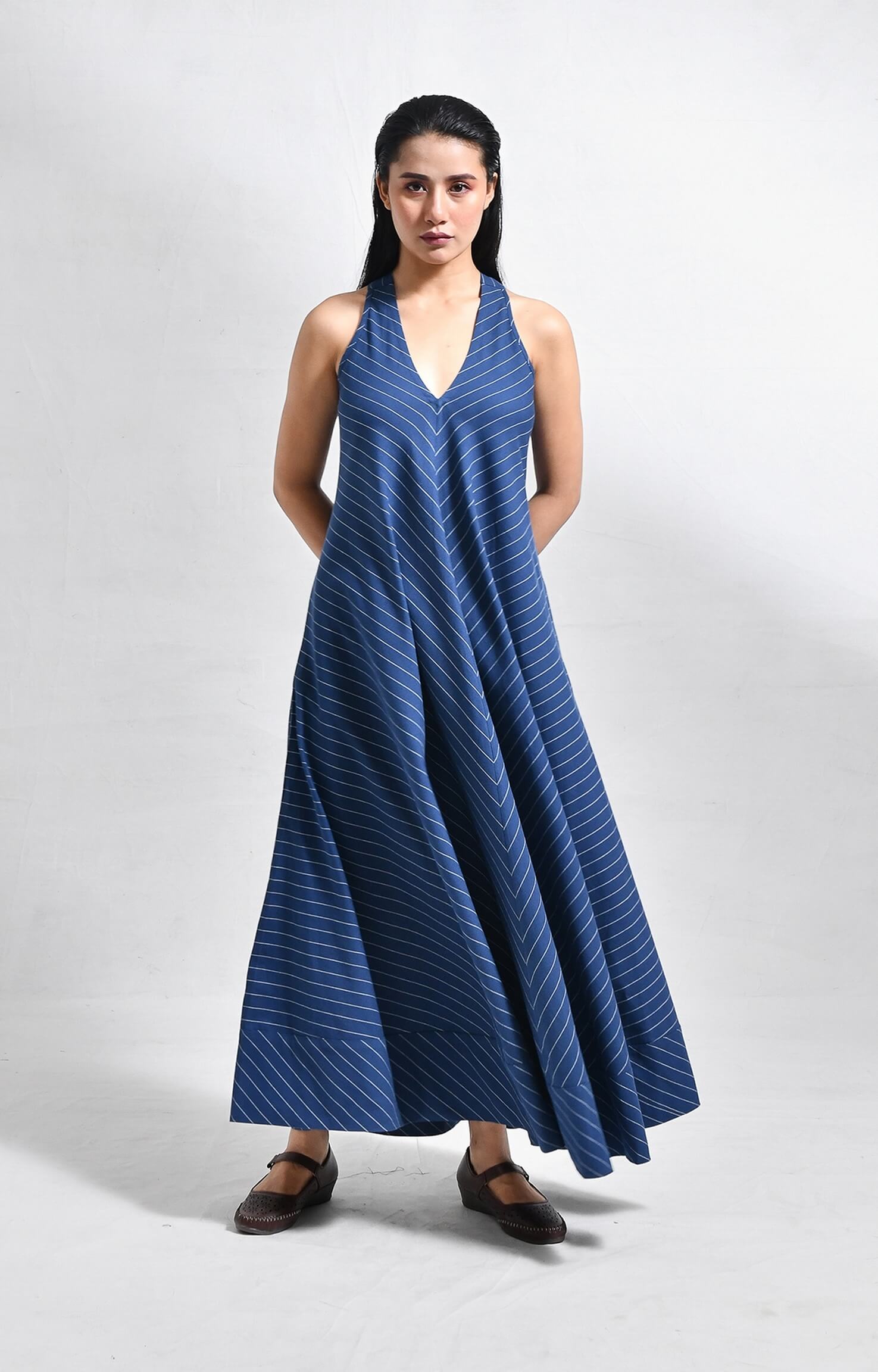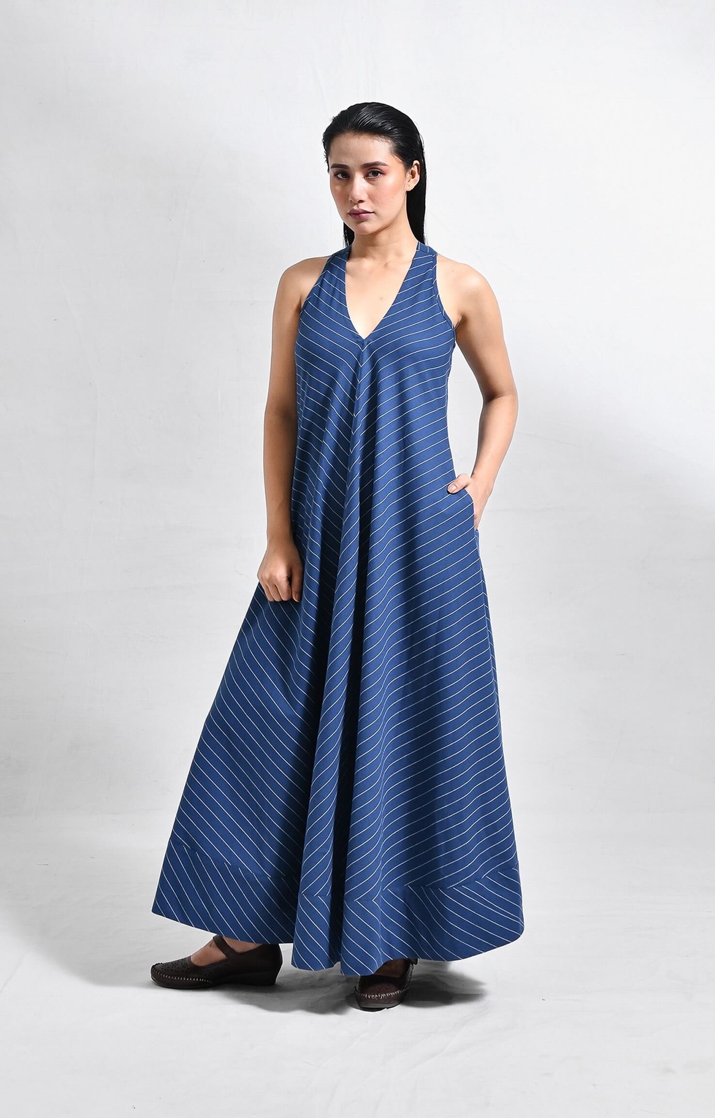 Crafted from handloom cotton with finely woven pinstripes, this sleeveless halter-neck dress features a twist detail at the back neckline. Fitted at the bust, it flares gracefully and includes functional side pockets for added ease.