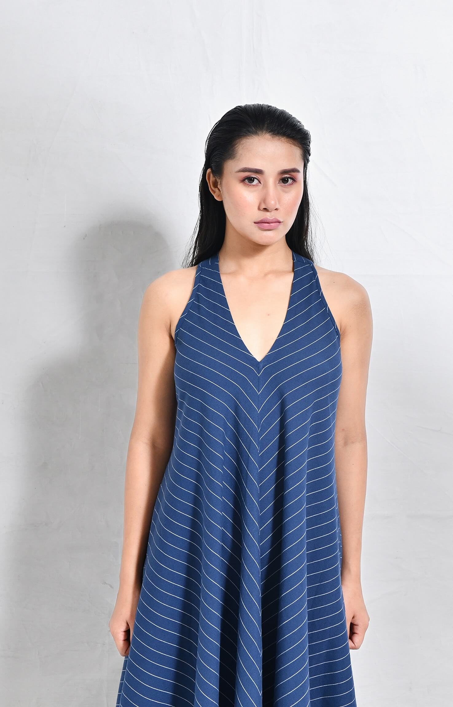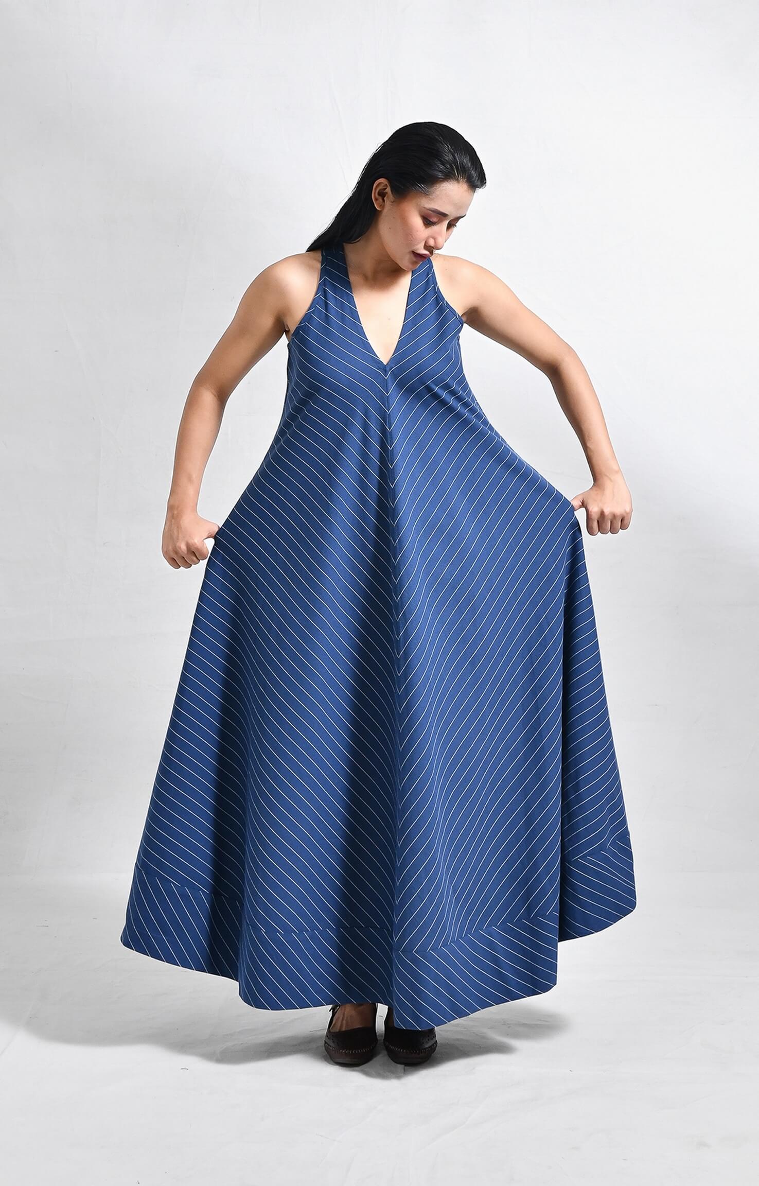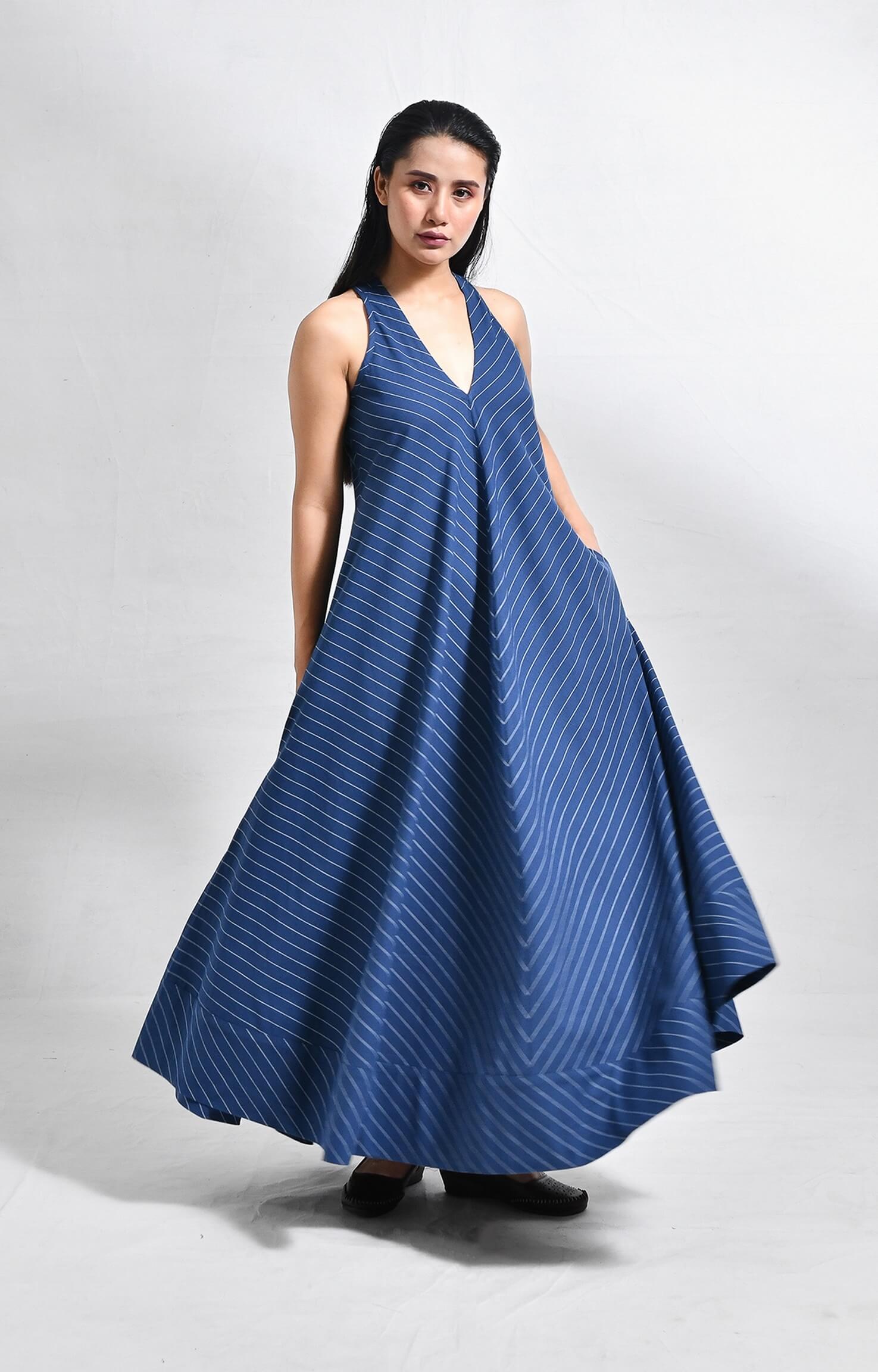 Crafted from handloom cotton with finely woven pinstripes, this sleeveless halter-neck dress features a twist detail at the back neckline. Fitted at the bust, it flares gracefully and includes functional side pockets for added ease.