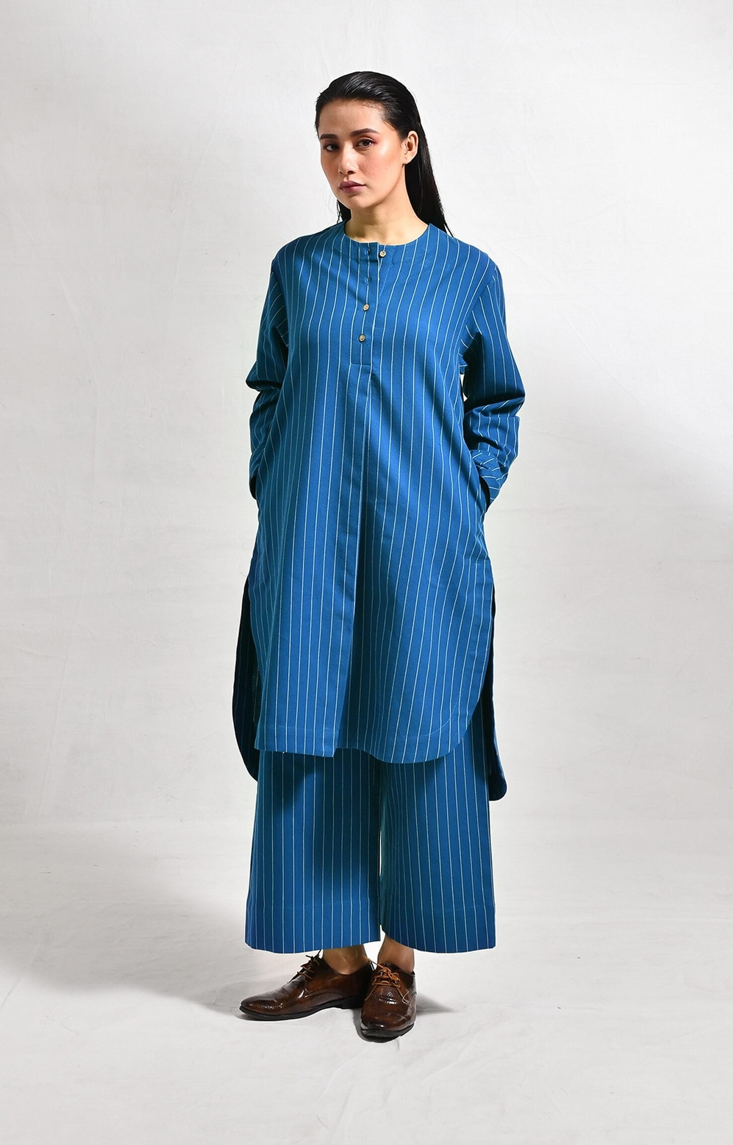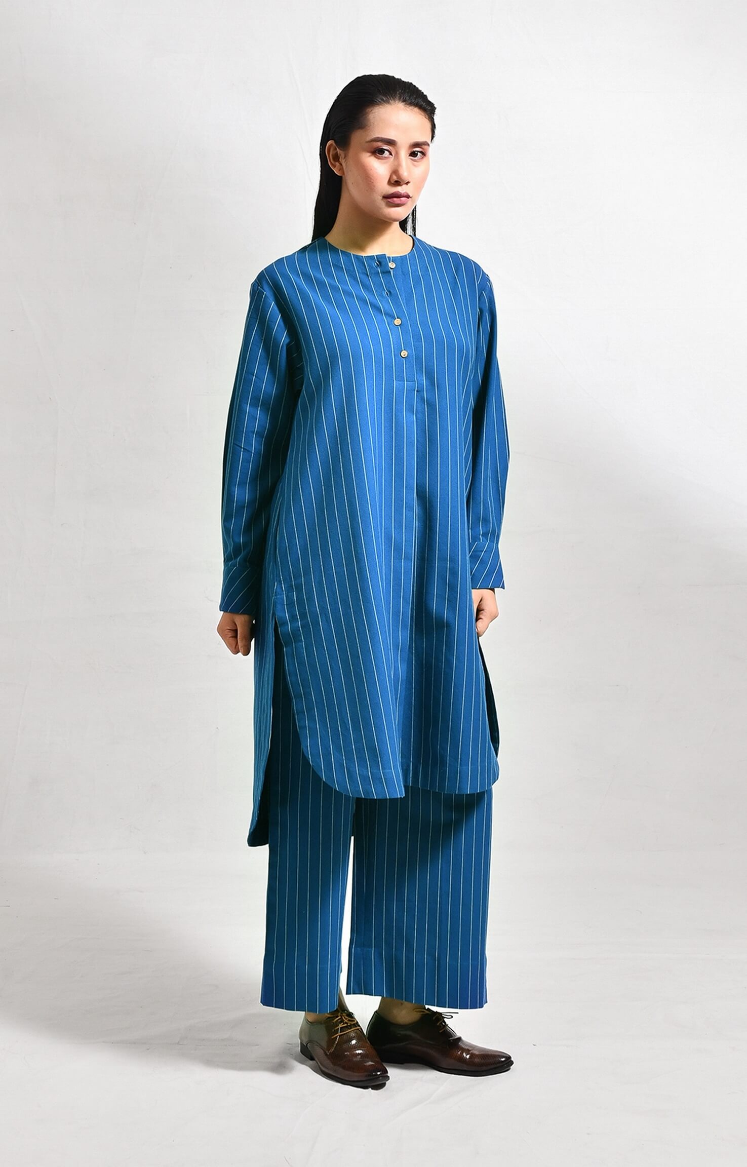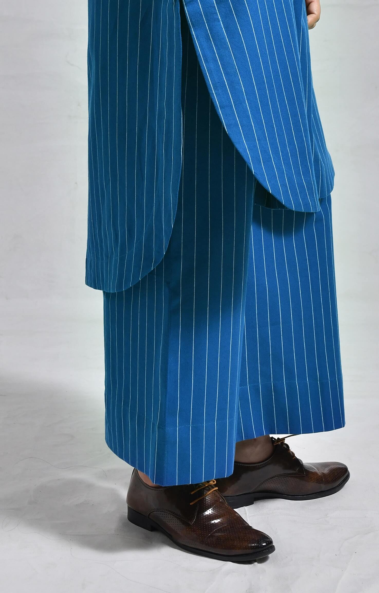 Crafted from handloom cotton, this straight-fit set features finely woven pinstripes. The kurta is designed with a sleek front placket, structured box pleats at the front and back, a side pocket, and a U-hemline. Paired with matching straight-fit trousers, it delivers a refined, minimal, and tailored look.