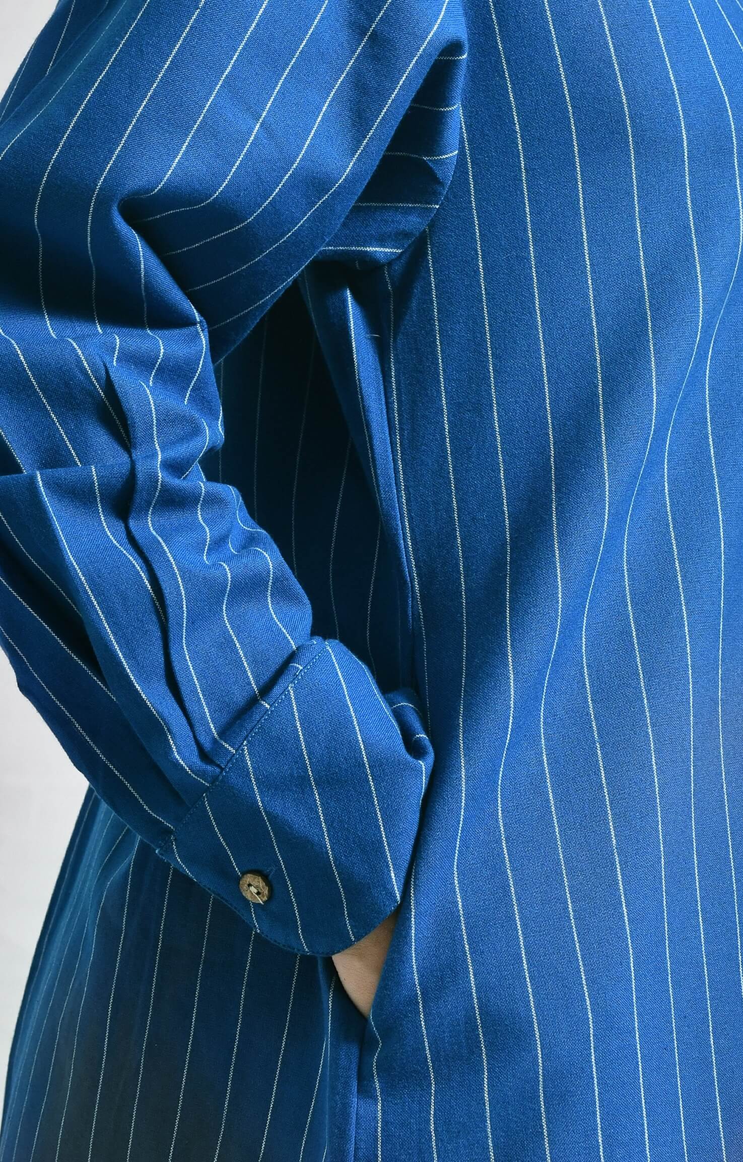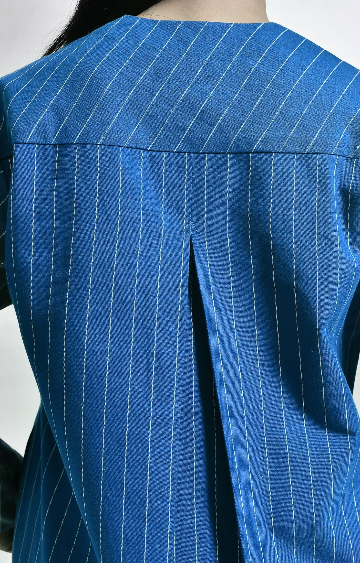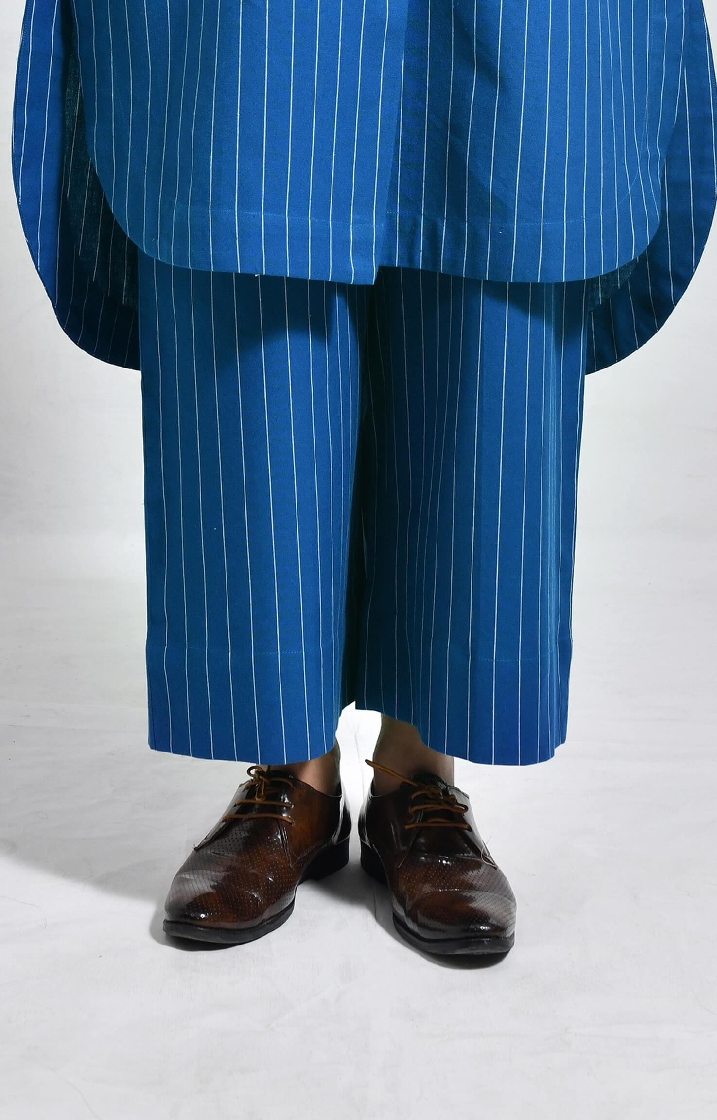 Crafted from handloom cotton, this straight-fit set features finely woven pinstripes. The kurta is designed with a sleek front placket, structured box pleats at the front and back, a side pocket, and a U-hemline. Paired with matching straight-fit trousers, it delivers a refined, minimal, and tailored look.
