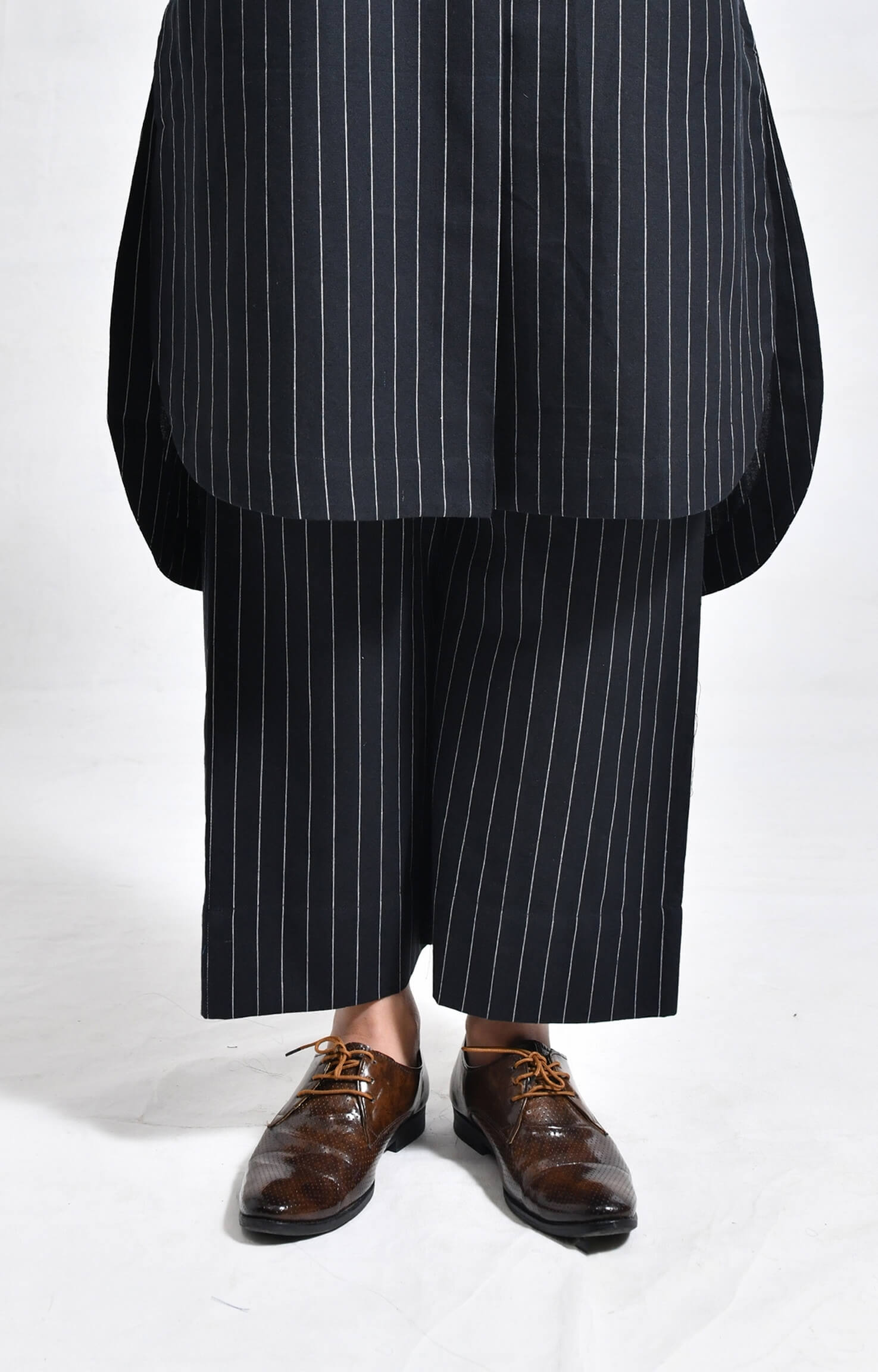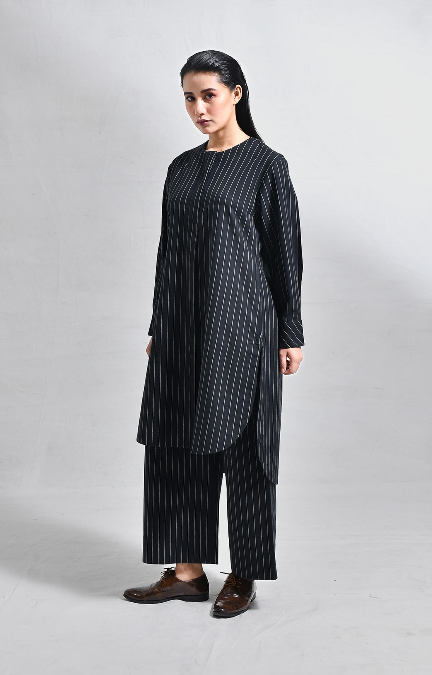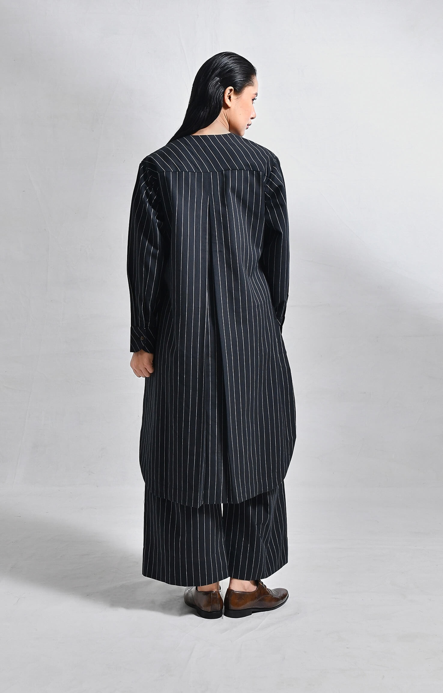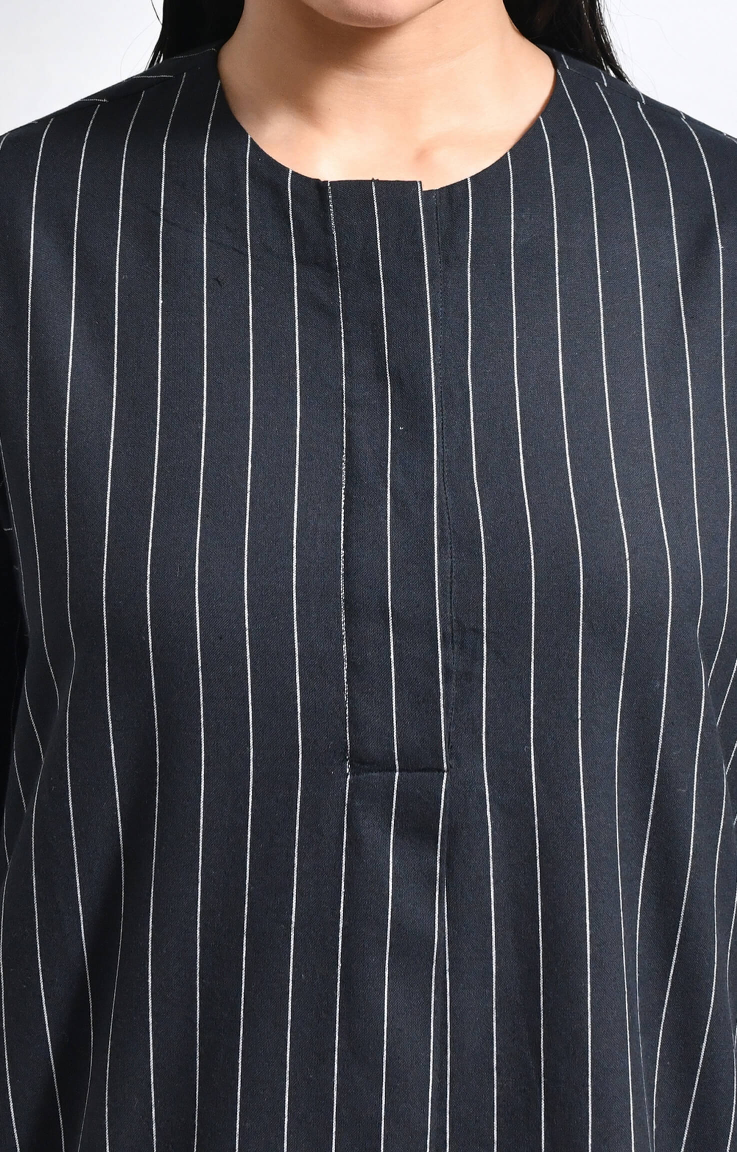 Crafted from handloom cotton, this straight-fit set features finely woven pinstripes. The kurta is designed with a sleek front placket, structured box pleats at the front and back, a side pocket, and a U-hemline. Paired with matching straight-fit trousers, it delivers a refined, minimal, and tailored look.