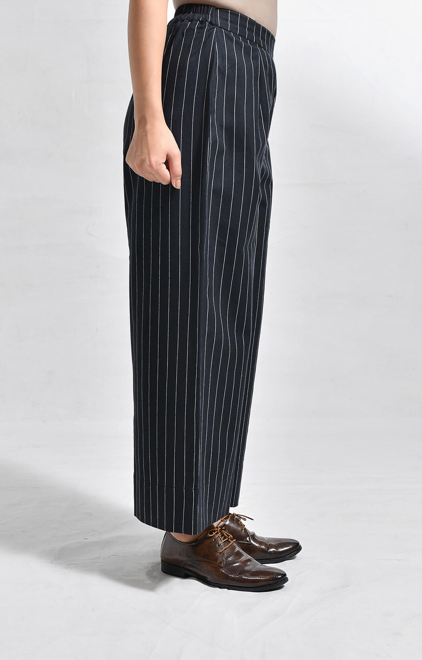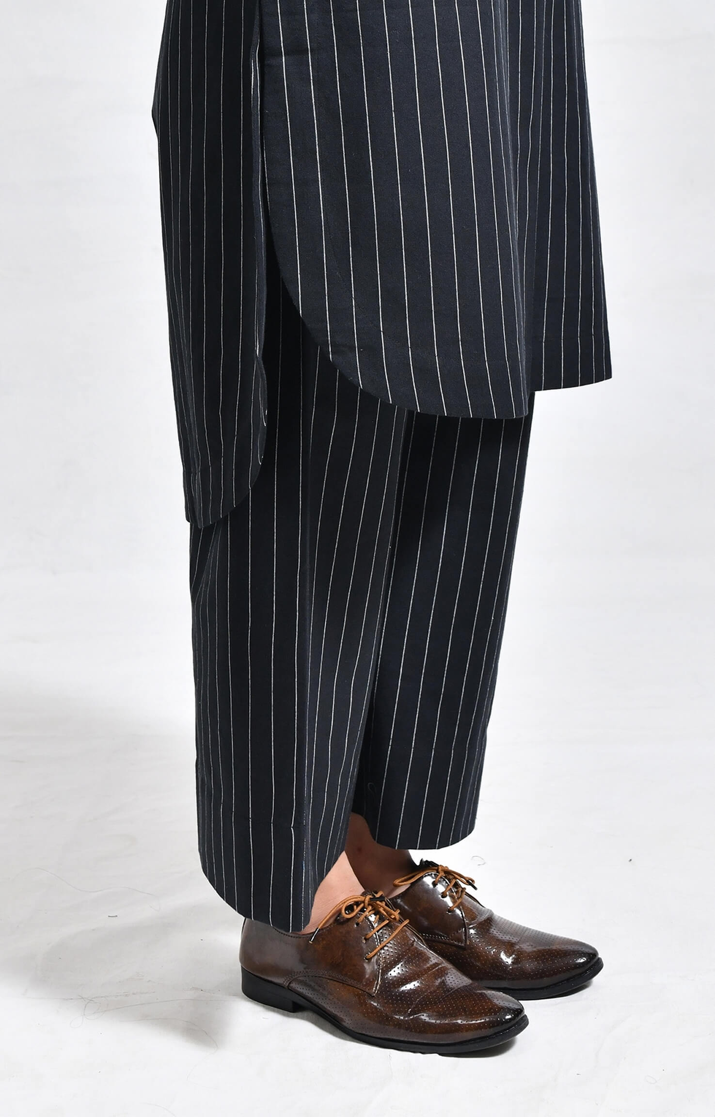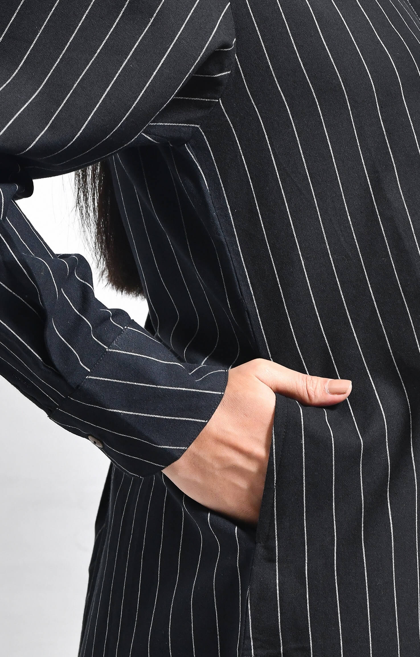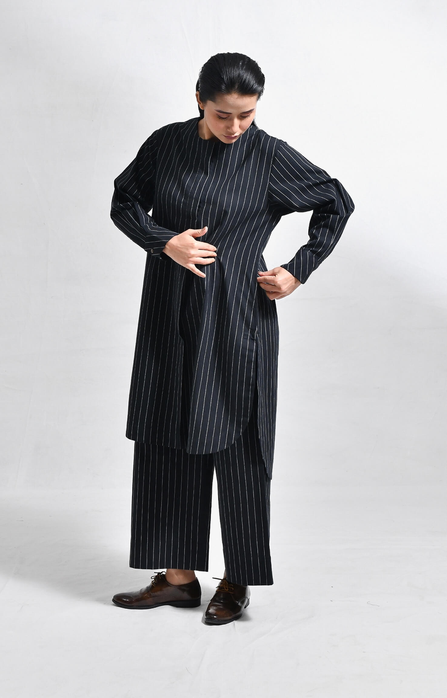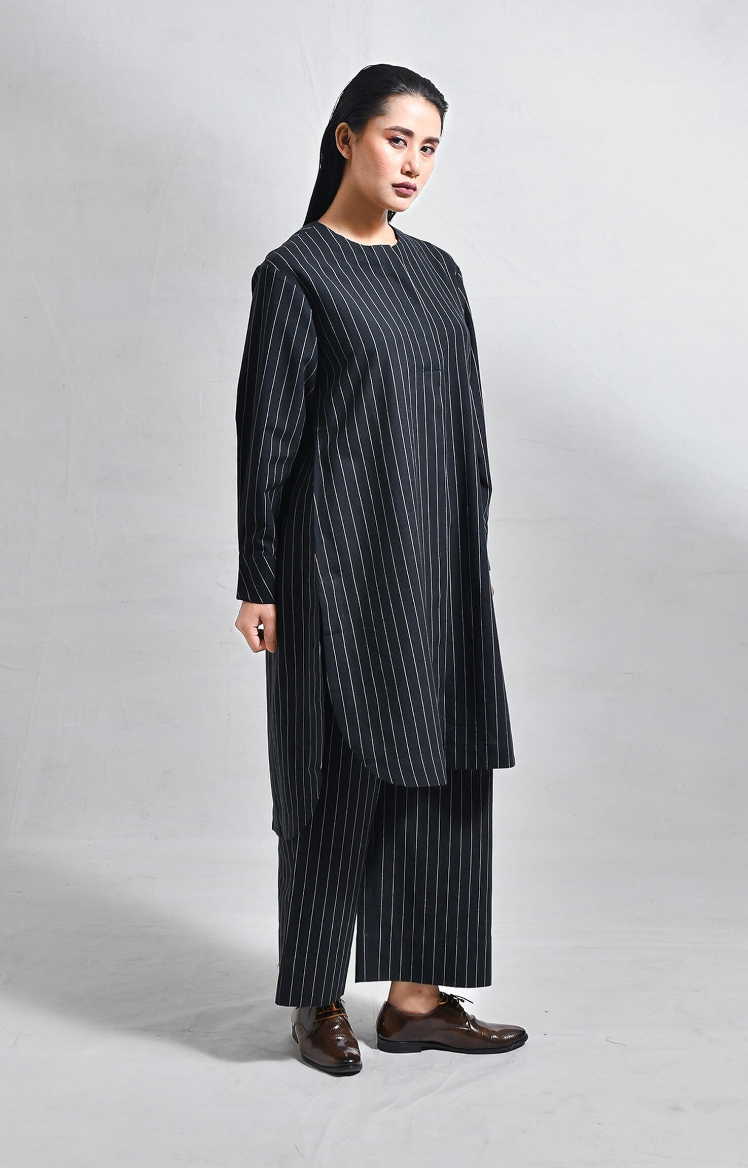 Crafted from handloom cotton, this straight-fit set features finely woven pinstripes. The kurta is designed with a sleek front placket, structured box pleats at the front and back, a side pocket, and a U-hemline. Paired with matching straight-fit trousers, it delivers a refined, minimal, and tailored look.