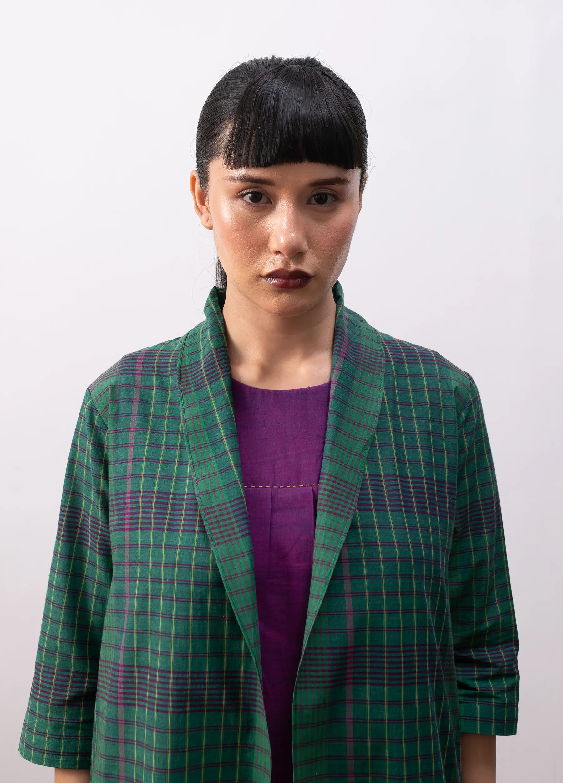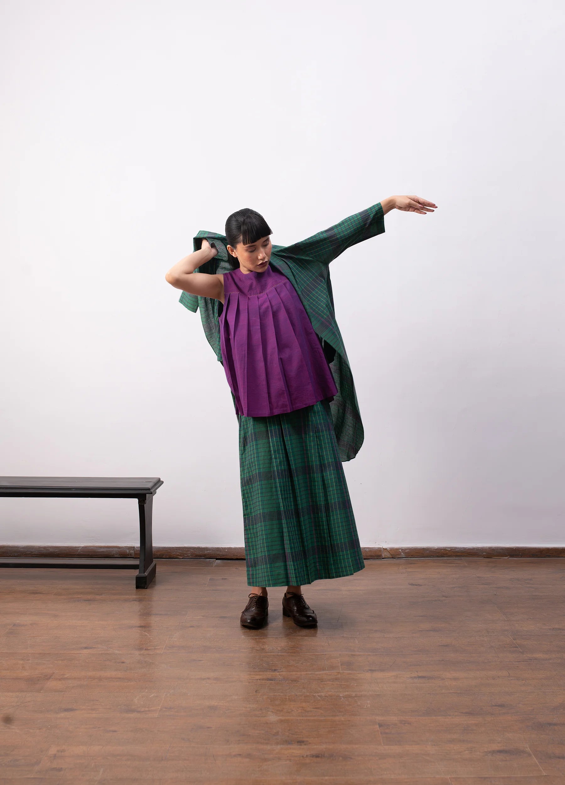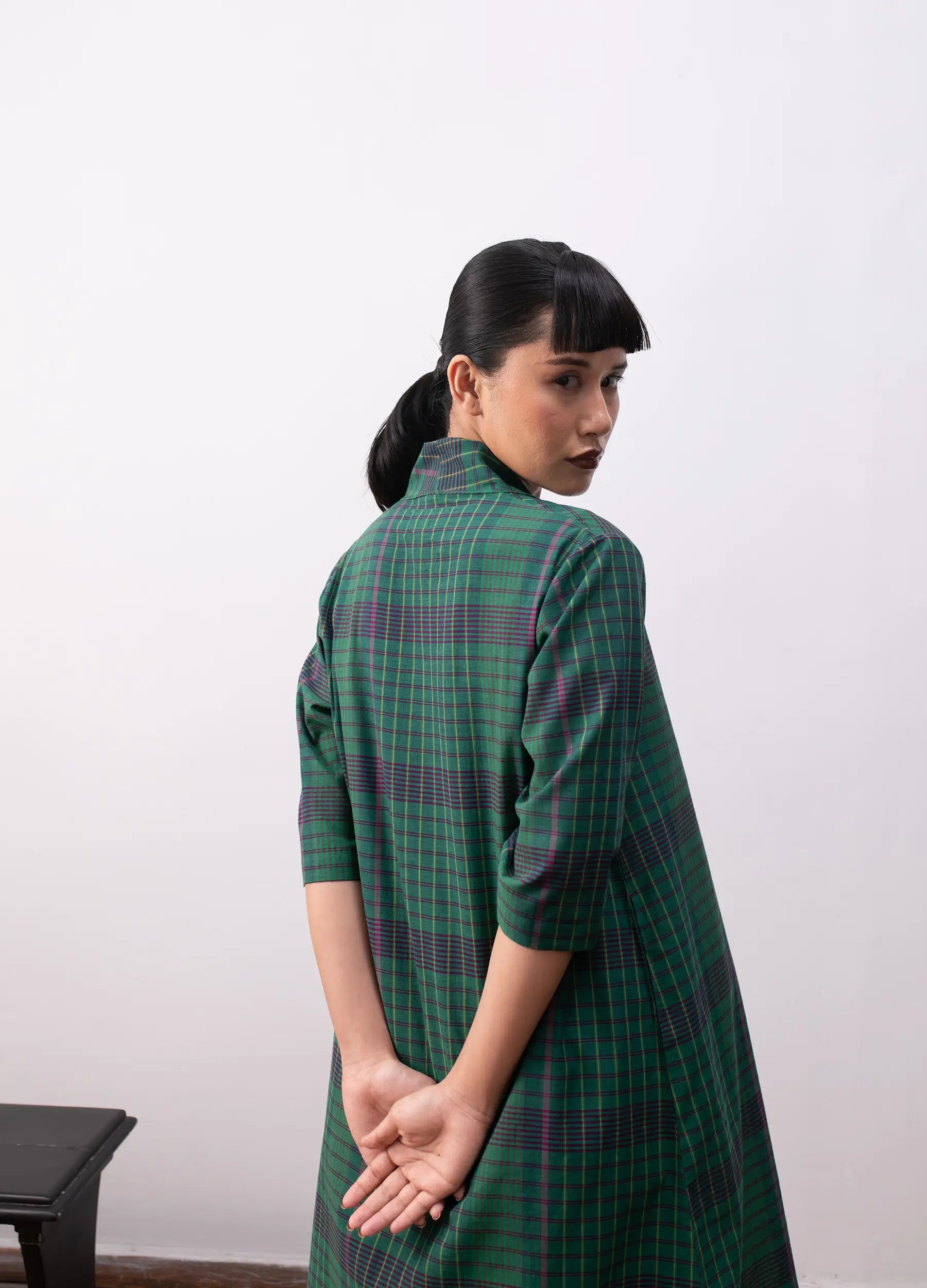 The Madras checks create movement across the surface while the silhouette remains balanced.