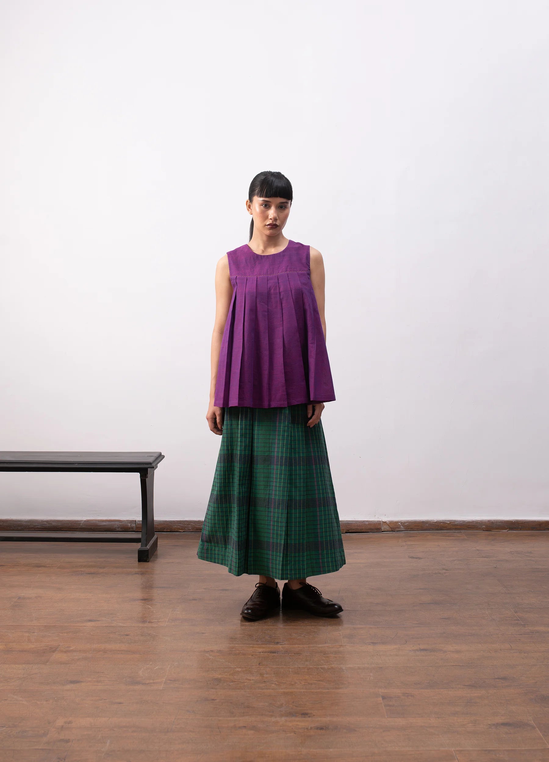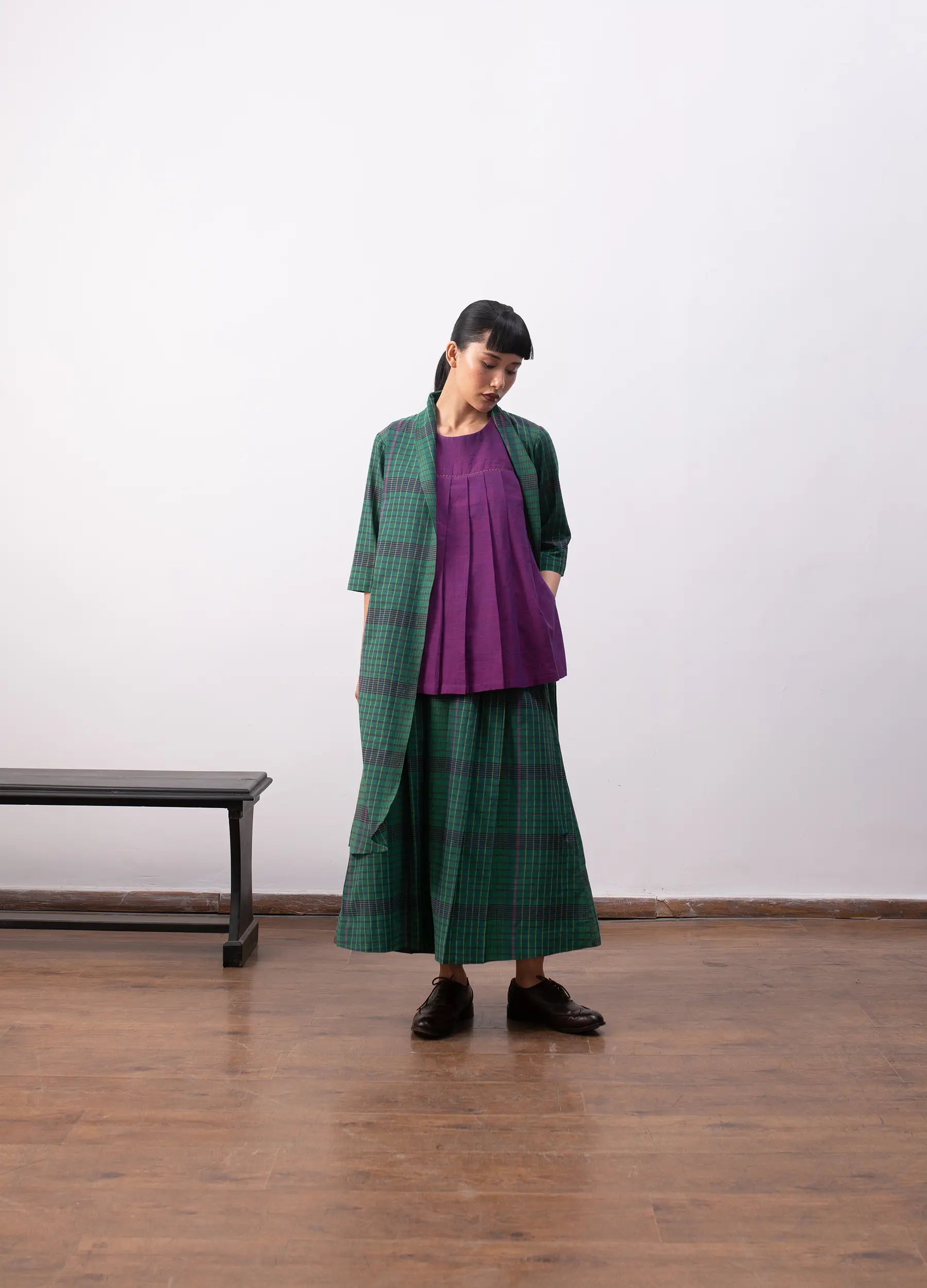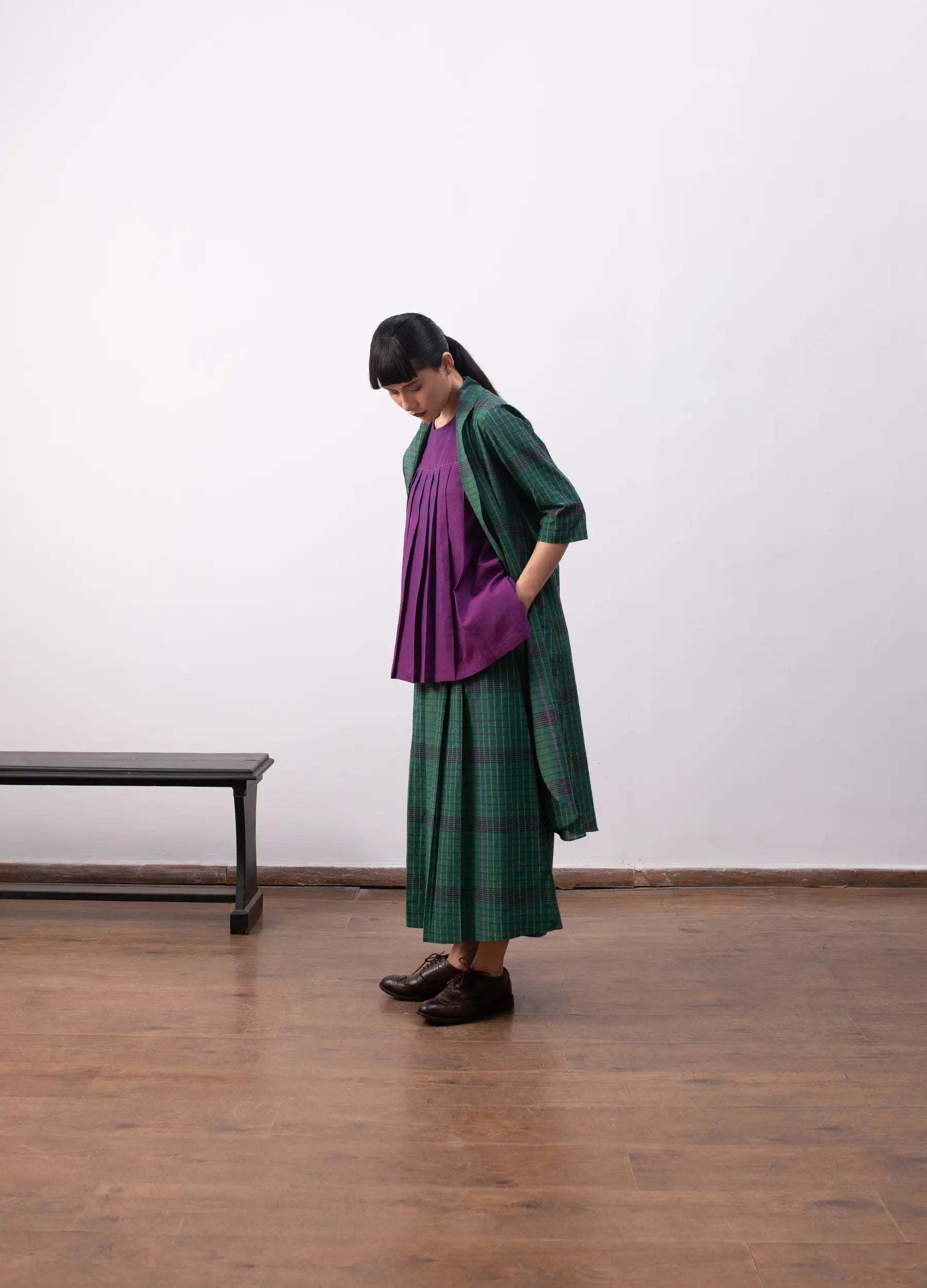 The Madras checks create movement across the surface while the silhouette remains balanced.