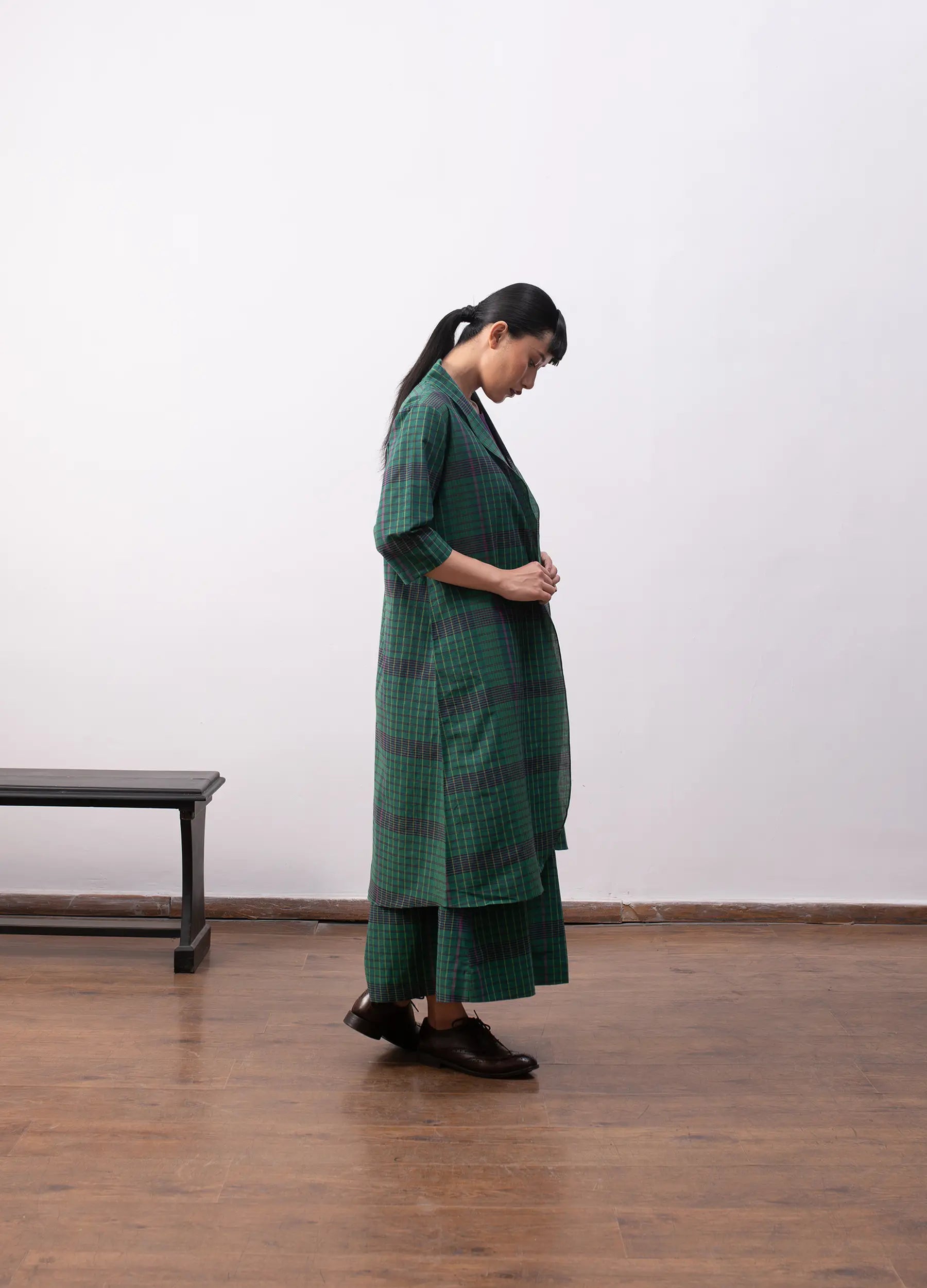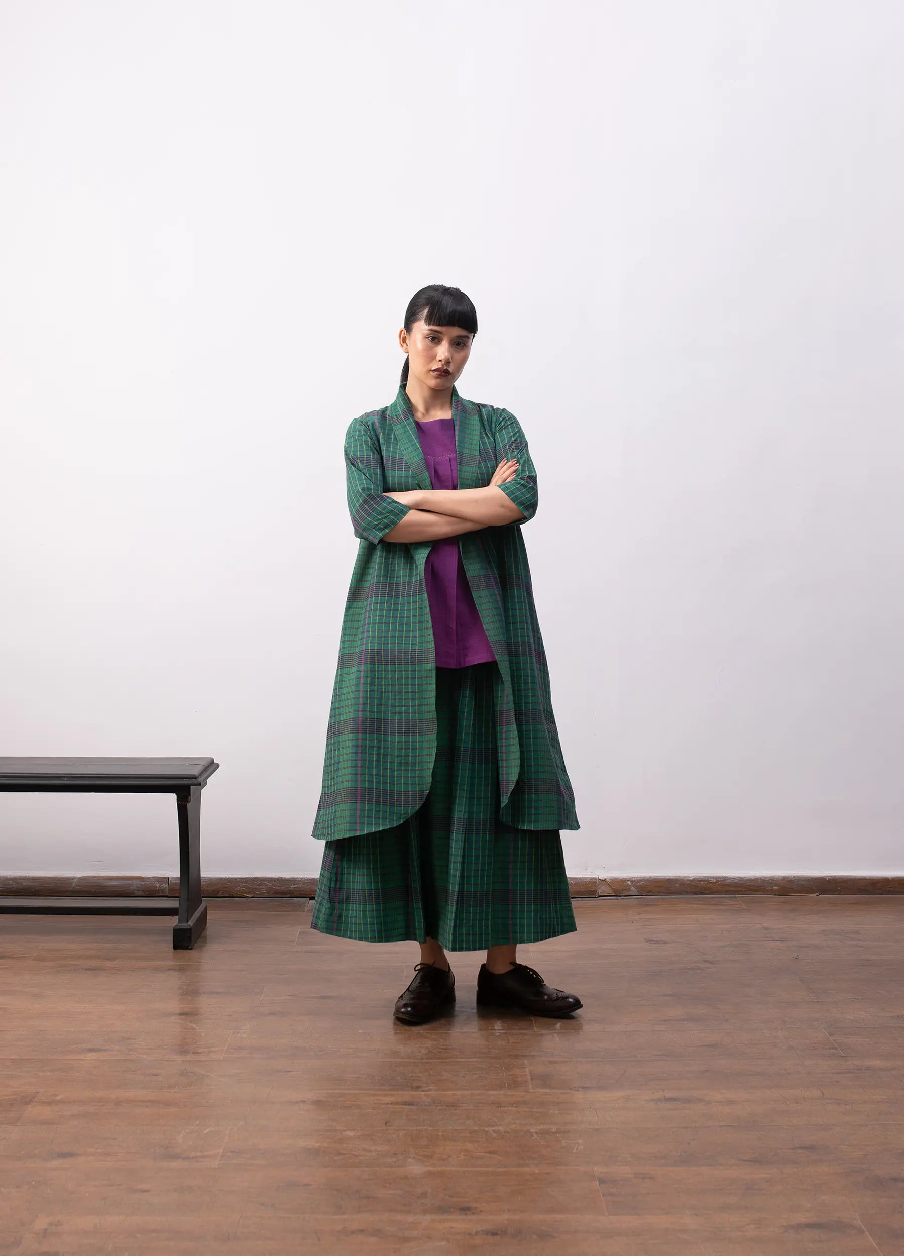 A three-piece silhouette in handspun khadi, where pattern and proportion work in quiet rhythm.