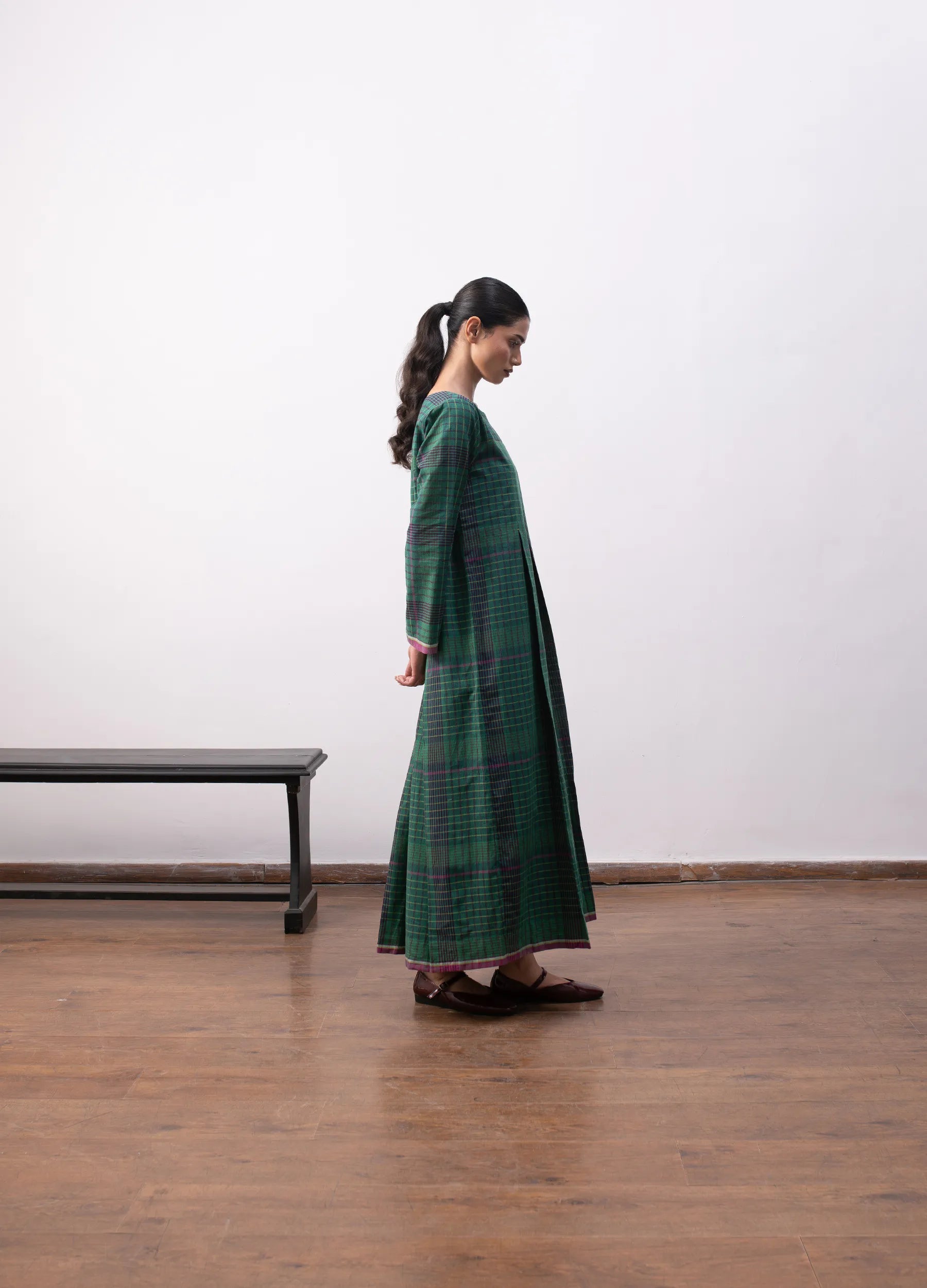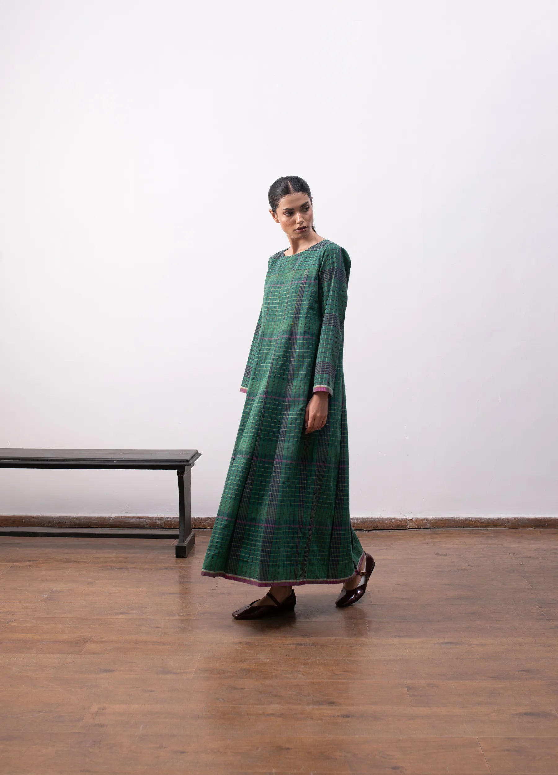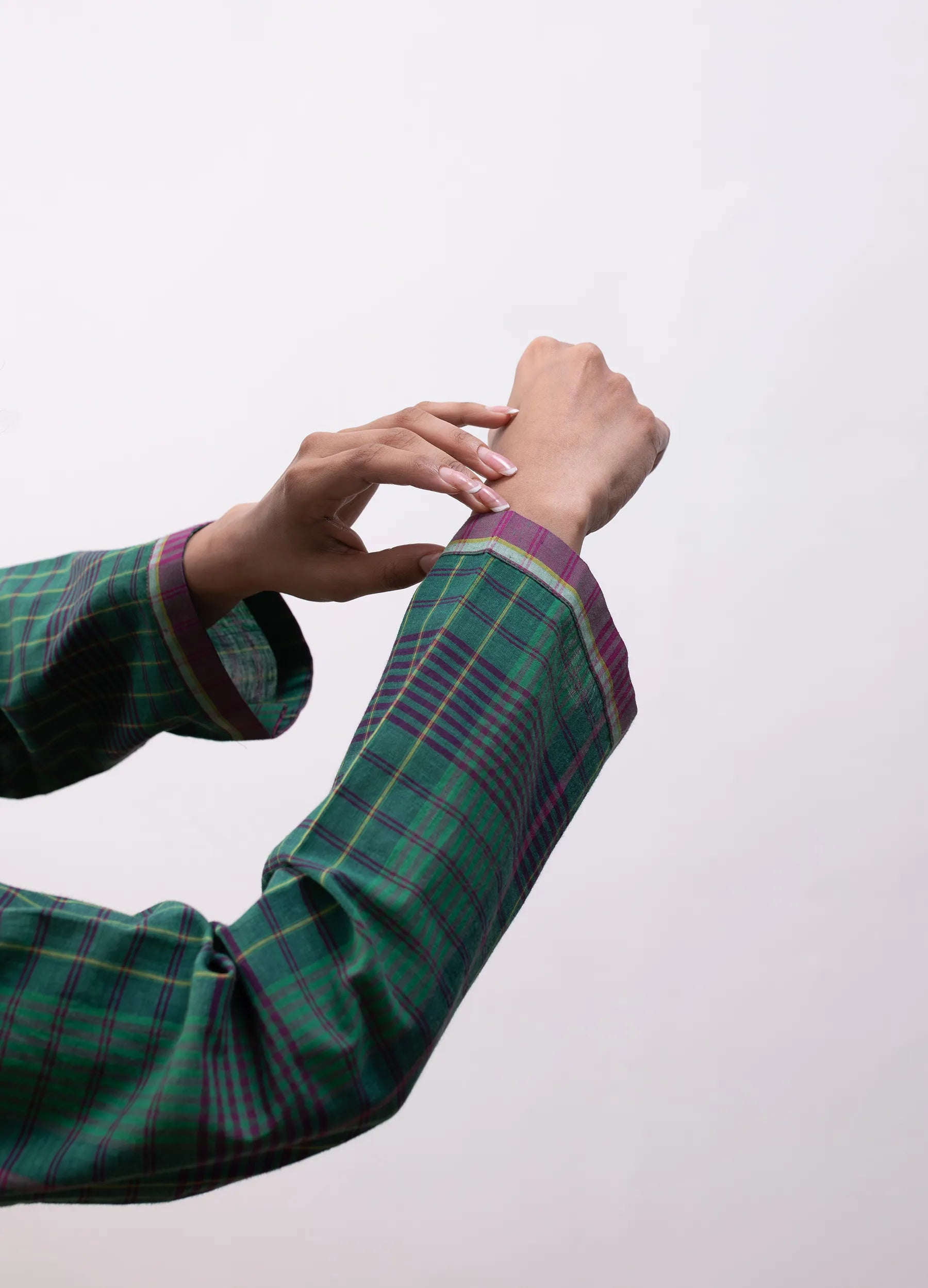 A composed silhouette in khadi Madras checks, where pattern introduces movement.