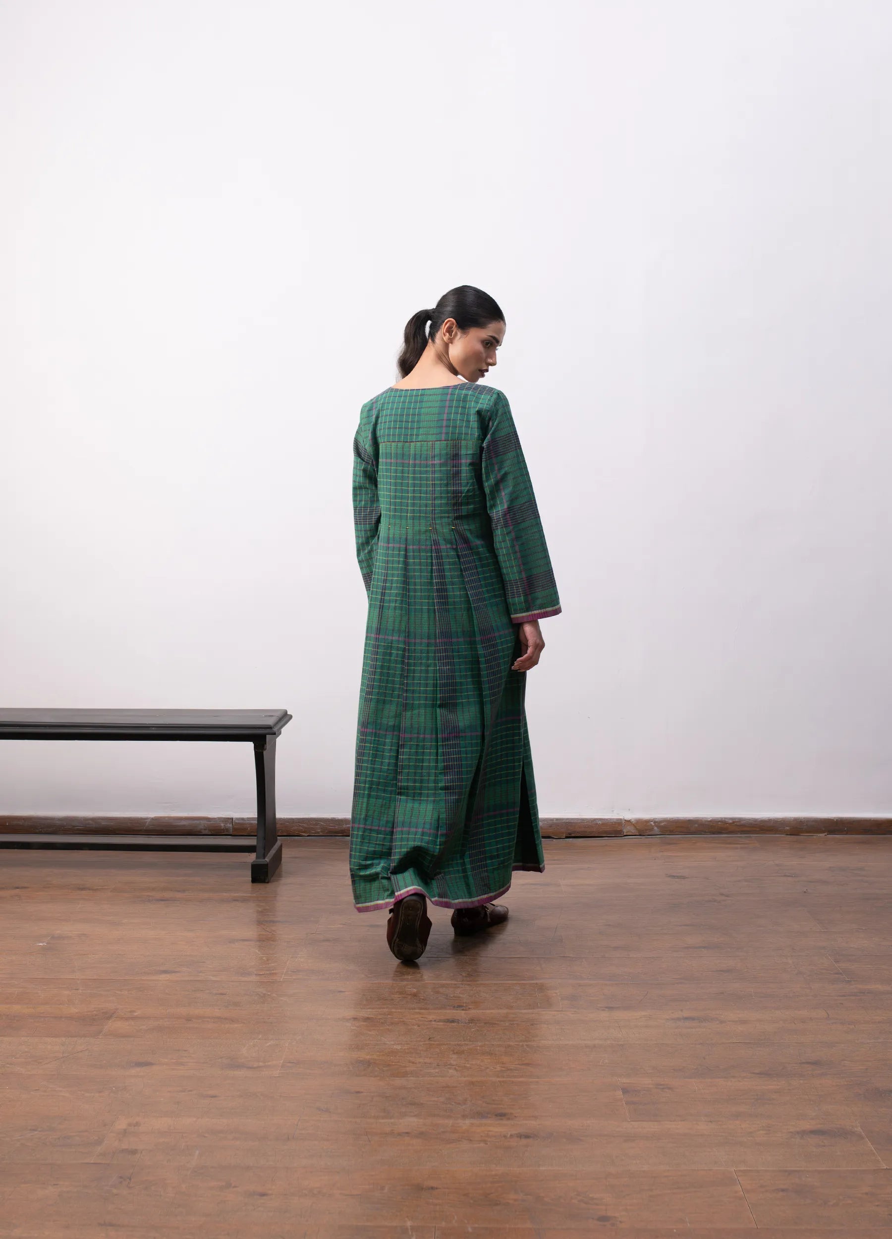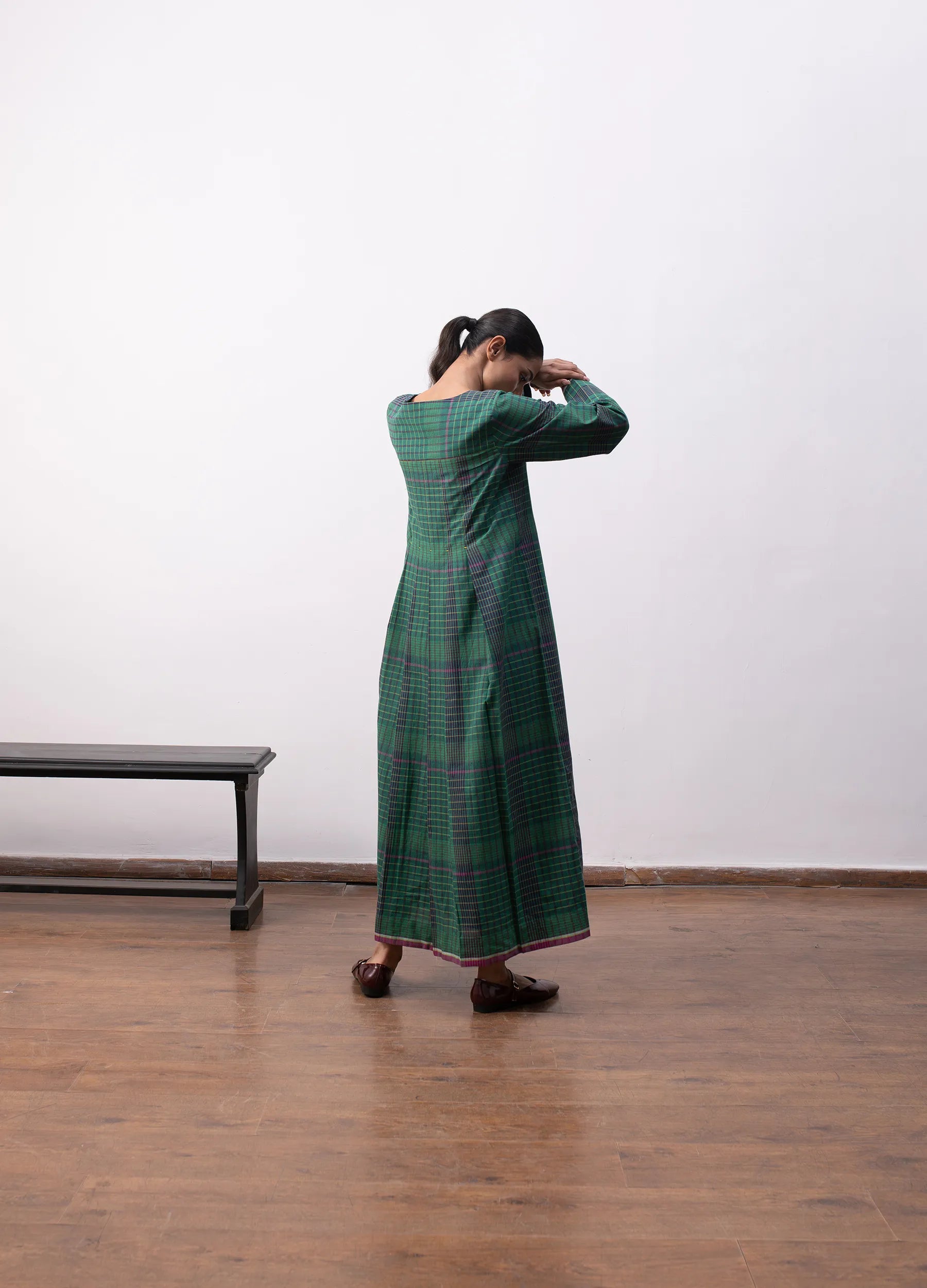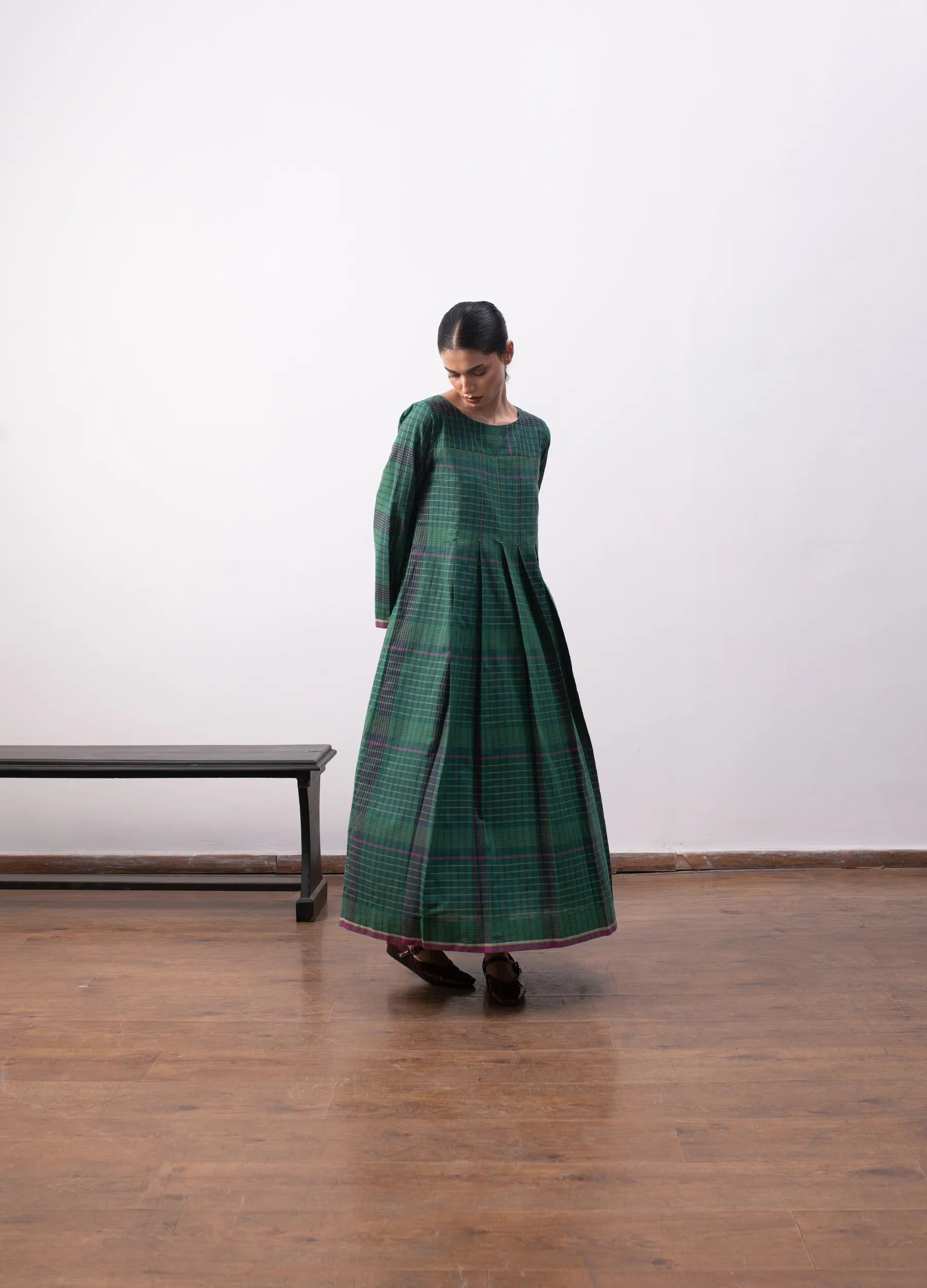 A composed silhouette in khadi Madras checks, where pattern introduces movement.